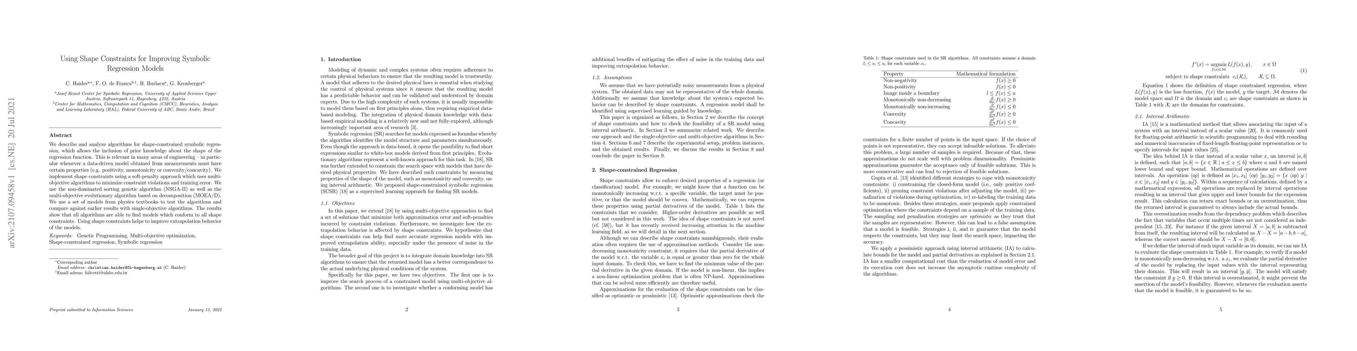 This paper proposes algorithms for shape-constrained symbolic regression, which incorporate prior knowledge about the regression function's shape, improving data-driven models in engineering. It uses soft-penalty methods and multi-objective algorithms like NSGA-II and MOEA/D to achieve this, demonstrating improved extrapolation behavior in tested models.