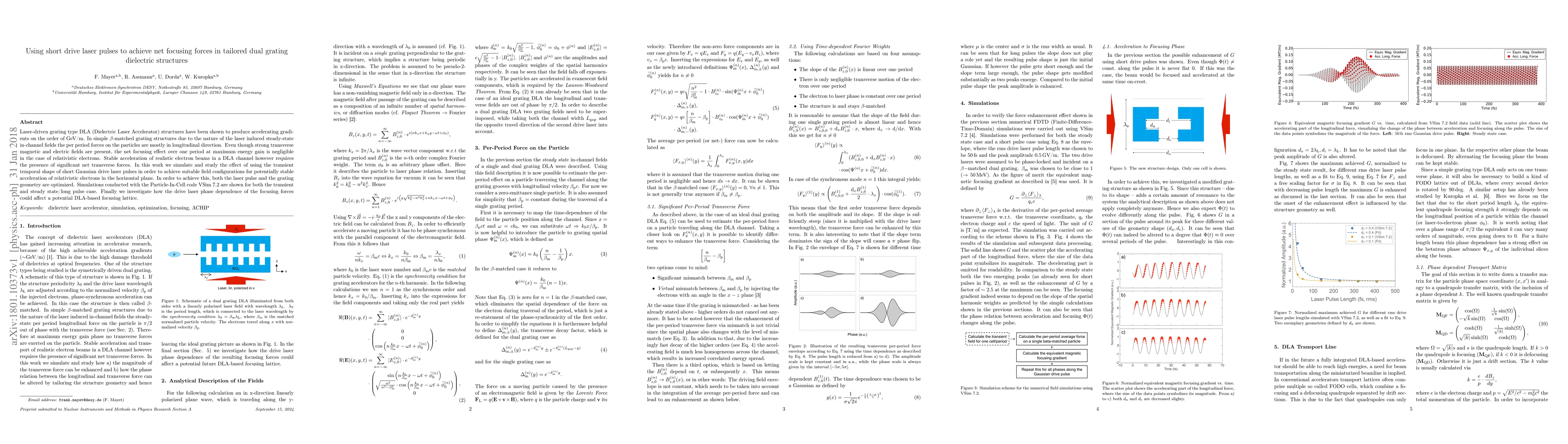 Laser-driven grating type DLA (Dielectric Laser Accelerator) structures have been shown to produce accelerating gradients on the order of GeV/m. In simple $\beta$-matched grating structures due to the nature of the laser induced steady-state in-channel fields the per period forces on the particles are mostly in longitudinal direction. Even though strong transverse magnetic and electric fields are present, the net focusing effect over one period at maximum energy gain is negligible in the case of relativistic electrons. Stable acceleration of realistic electron beams in a DLA channel however requires the presence of significant net transverse forces. In this work we simulate and study the effect of using the transient temporal shape of short Gaussian drive laser pulses in order to achieve suitable field configurations for potentially stable acceleration of relativistic electrons in the horizontal plane. In order to achieve this, both the laser pulse and the grating geometry are optimized. Simulations conducted with the Particle-In-Cell code VSim 7.2 are shown for both the transient and steady state/long pulse case. Finally we investigate how the drive laser phase dependence of the focusing forces could affect a potential DLA-based focusing lattice.
