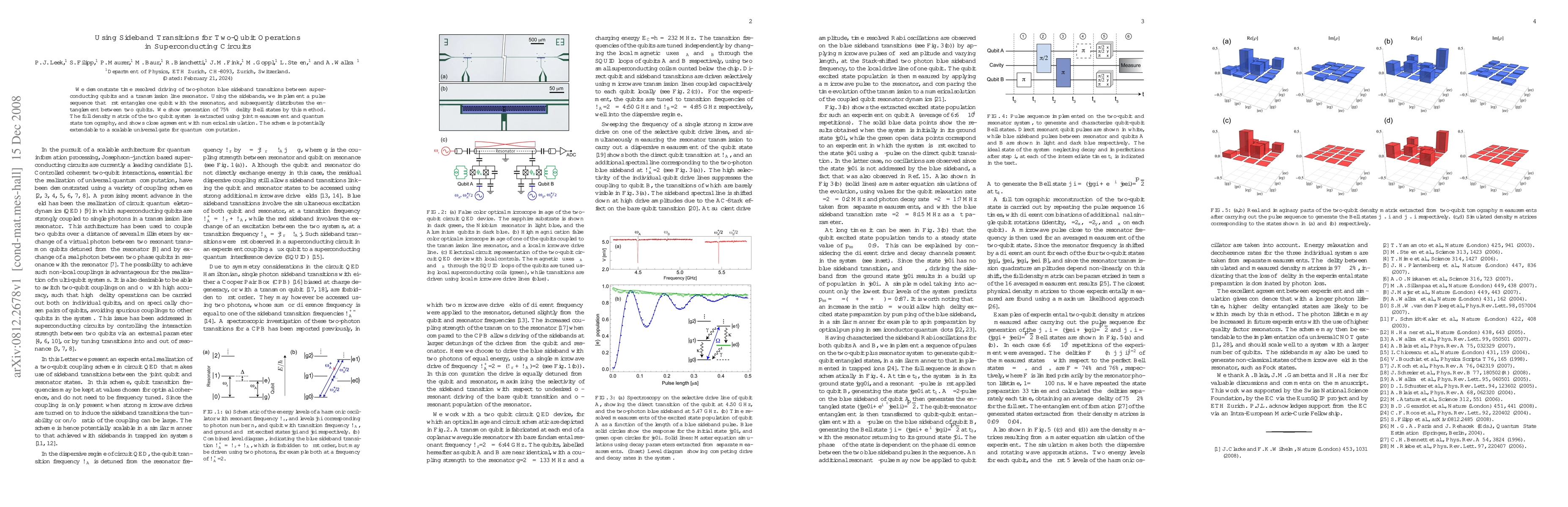 This paper demonstrates the use of two-photon blue sideband transitions in superconducting circuits to entangle and manipulate qubits, achieving 75% fidelity Bell states. The method involves a pulse sequence that first entangles a qubit with a resonator and then distributes the entanglement between two qubits, with potential for scalability in quantum computation.