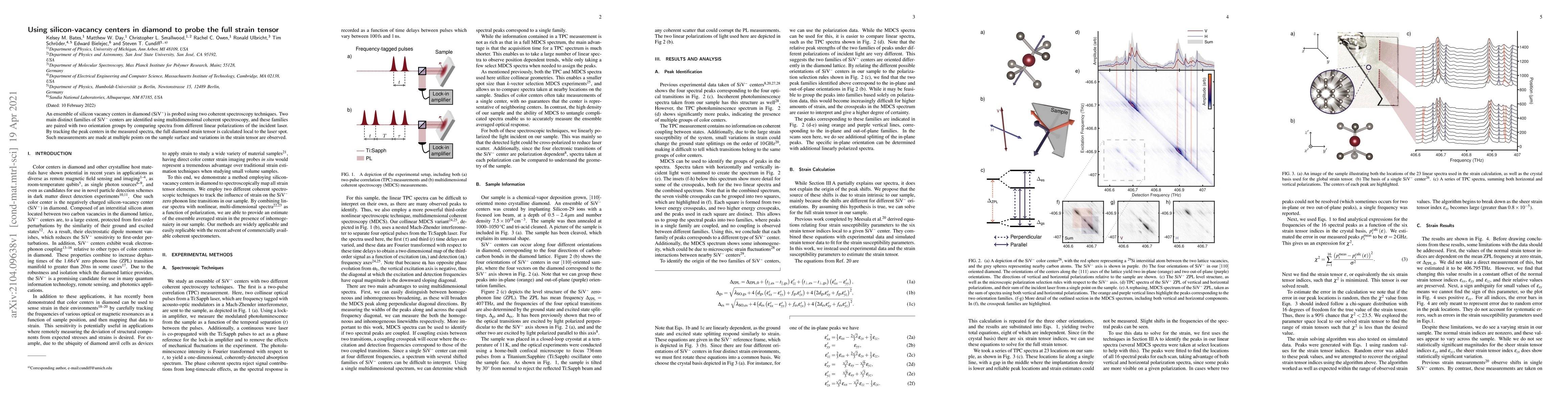 The study employs silicon-vacancy centers in diamond to measure the full strain tensor using coherent spectroscopy techniques, identifying distinct center families and their orientations, and determining local strain variations across the sample.