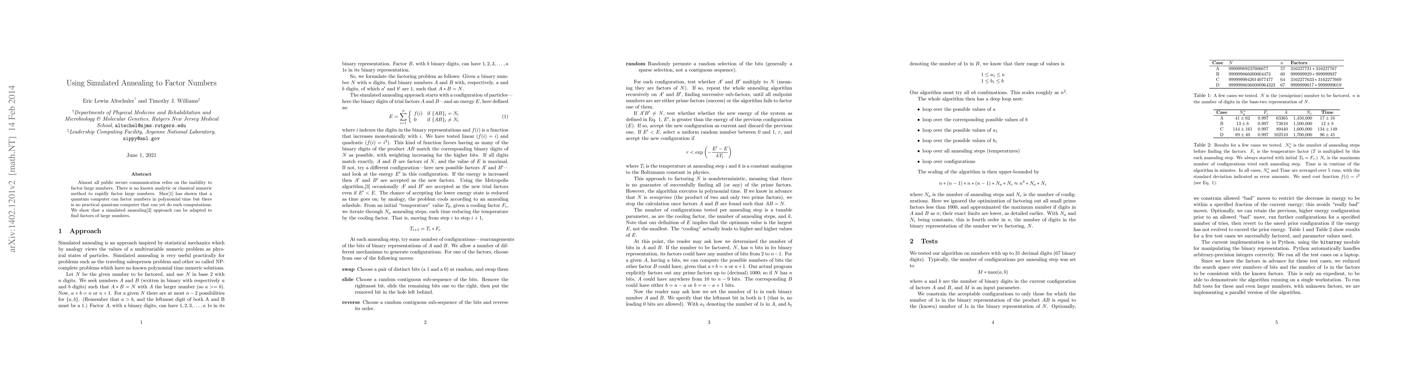 Almost all public secure communication relies on the inability to factor large numbers. There is no known analytic or classical numeric method to rapidly factor large numbers. Shor[1] has shown that a quantum computer can factor numbers in polynomial time but there is no practical quantum computer that can yet do such computations. We show that a simulated annealing[2] approach can be adapted to find factors of large numbers.