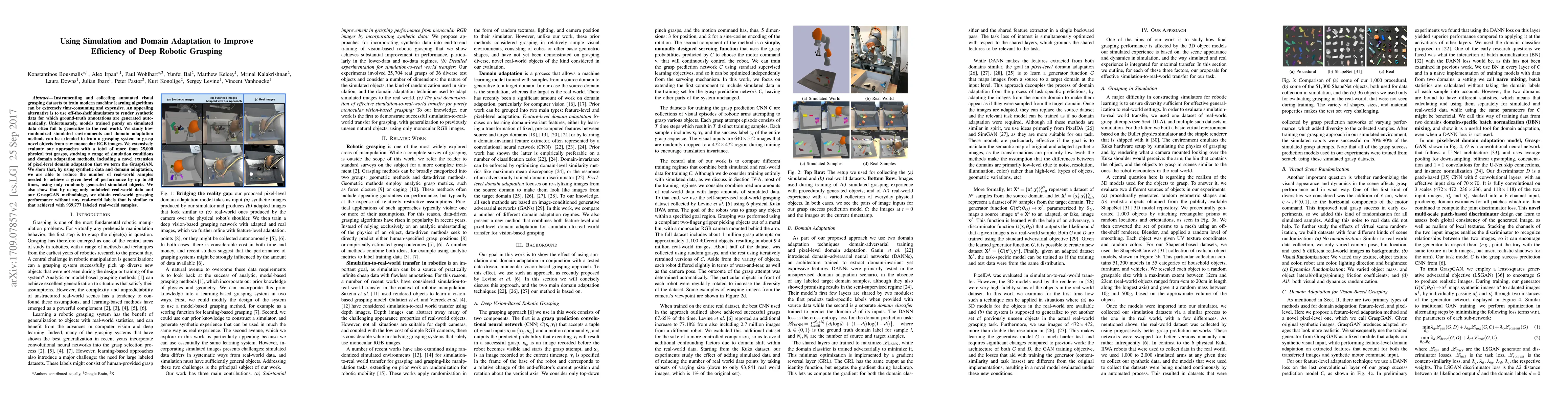 Instrumenting and collecting annotated visual grasping datasets to train modern machine learning algorithms can be extremely time-consuming and expensive. An appealing alternative is to use off-the-shelf simulators to render synthetic data for which ground-truth annotations are generated automatically. Unfortunately, models trained purely on simulated data often fail to generalize to the real world. We study how randomized simulated environments and domain adaptation methods can be extended to train a grasping system to grasp novel objects from raw monocular RGB images. We extensively evaluate our approaches with a total of more than 25,000 physical test grasps, studying a range of simulation conditions and domain adaptation methods, including a novel extension of pixel-level domain adaptation that we term the GraspGAN. We show that, by using synthetic data and domain adaptation, we are able to reduce the number of real-world samples needed to achieve a given level of performance by up to 50 times, using only randomly generated simulated objects. We also show that by using only unlabeled real-world data and our GraspGAN methodology, we obtain real-world grasping performance without any real-world labels that is similar to that achieved with 939,777 labeled real-world samples.
