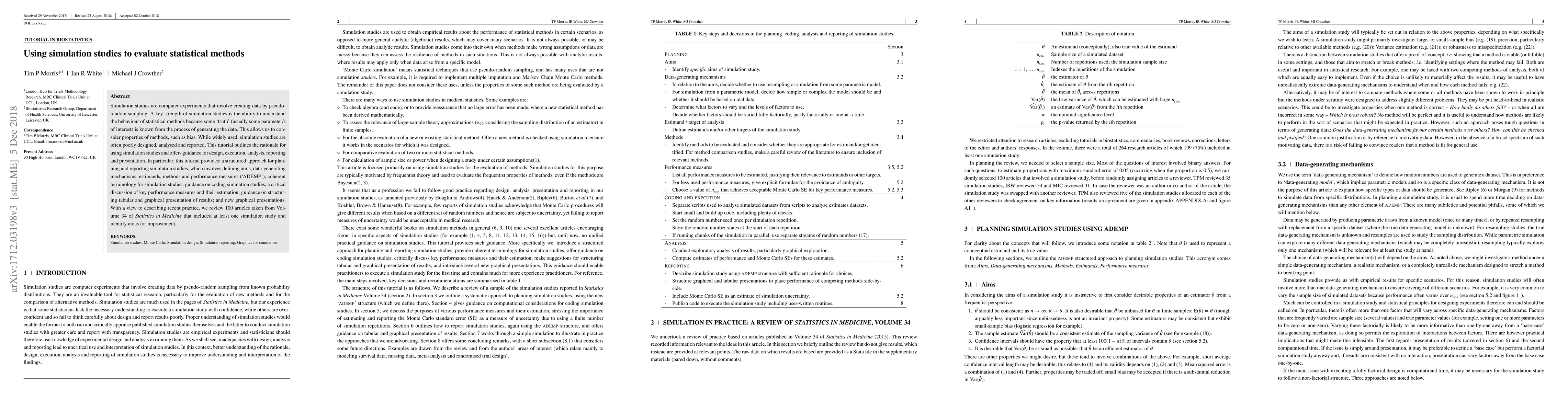 Simulation studies are computer experiments that involve creating data by pseudorandom sampling. The key strength of simulation studies is the ability to understand the behaviour of statistical methods because some 'truth' (usually some parameter/s of interest) is known from the process of generating the data. This allows us to consider properties of methods, such as bias. While widely used, simulation studies are often poorly designed, analysed and reported. This tutorial outlines the rationale for using simulation studies and offers guidance for design, execution, analysis, reporting and presentation. In particular, this tutorial provides: a structured approach for planning and reporting simulation studies, which involves defining aims, data-generating mechanisms, estimands, methods and performance measures ('ADEMP'); coherent terminology for simulation studies; guidance on coding simulation studies; a critical discussion of key performance measures and their estimation; guidance on structuring tabular and graphical presentation of results; and new graphical presentations. With a view to describing recent practice, we review 100 articles taken from Volume 34 of Statistics in Medicine that included at least one simulation study and identify areas for improvement.