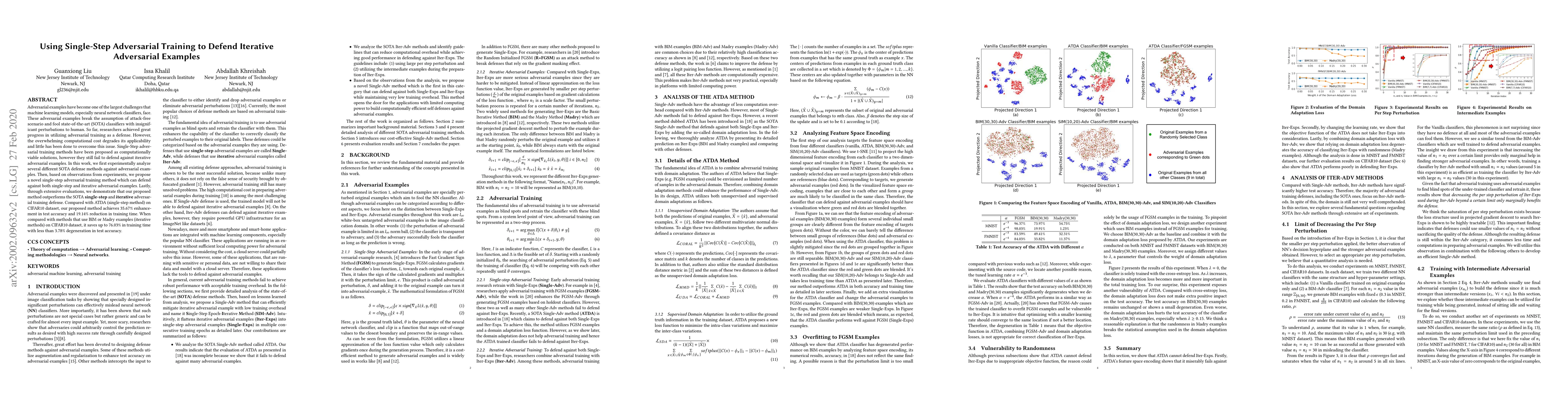 This paper proposes a novel single-step adversarial training method to defend against both single-step and iterative adversarial examples, achieving significant improvements over existing single-step and iterative methods in terms of test accuracy and training efficiency. The method demonstrates a 35.67% enhancement in test accuracy and a 19.14% reduction in training time compared to ATDA on CIFAR10.