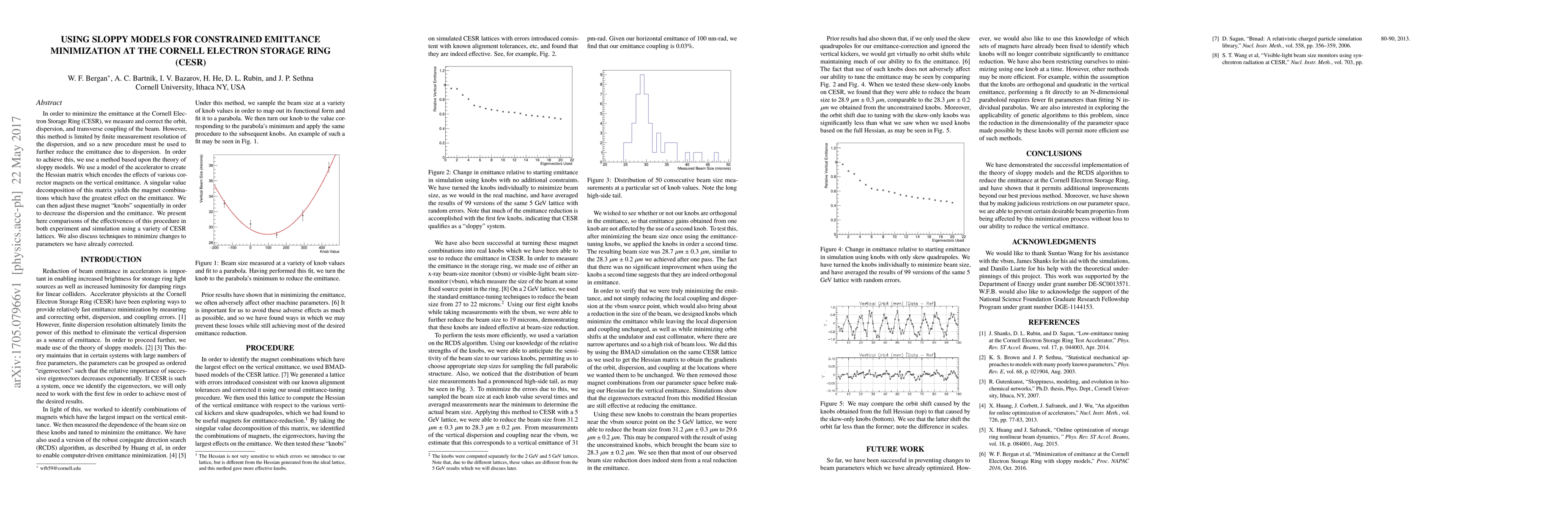 In order to minimize the emittance at the Cornell Electron Storage Ring (CESR), we measure and correct the orbit, dispersion, and transverse coupling of the beam. However, this method is limited by finite measurement resolution of the dispersion, and so a new procedure must be used to further reduce the emittance due to dispersion. In order to achieve this, we use a method based upon the theory of sloppy models. We use a model of the accelerator to create the Hessian matrix which encodes the effects of various corrector magnets on the vertical emittance. A singular value decomposition of this matrix yields the magnet combinations which have the greatest effect on the emittance. We can then adjust these magnet "knobs" sequentially in order to decrease the dispersion and the emittance. We present here comparisons of the effectiveness of this procedure in both experiment and simulation using a variety of CESR lattices. We also discuss techniques to minimize changes to parameters we have already corrected.