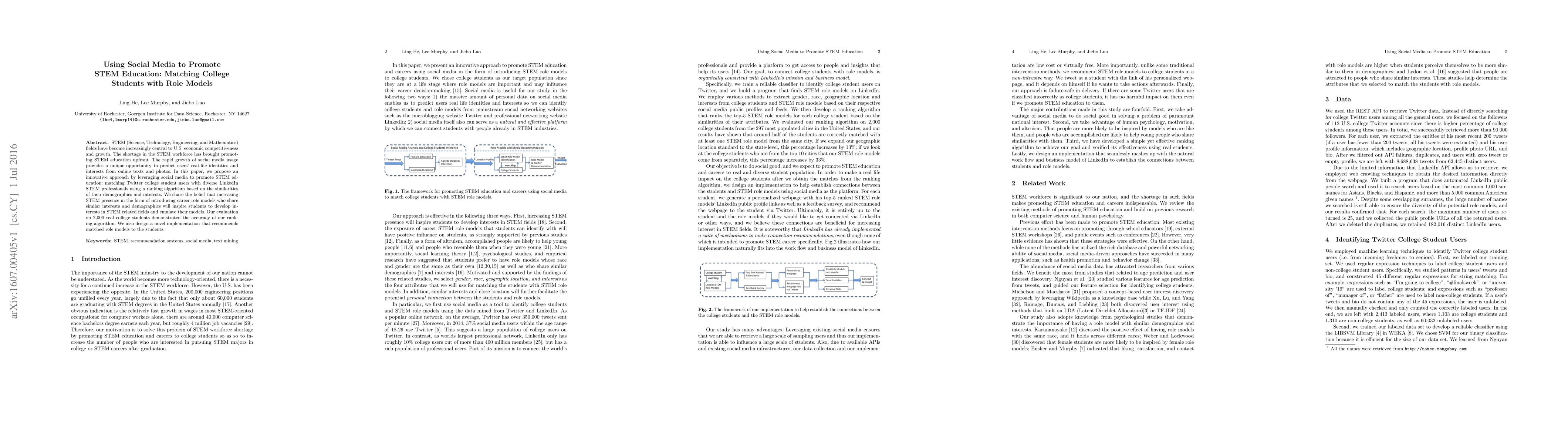 This paper proposes a method to enhance STEM education by using social media to match college students with LinkedIn STEM professionals who share similar demographics and interests, aiming to inspire students through relatable role models. The approach demonstrated accuracy in a ranking algorithm evaluation and includes a novel implementation for recommending these role models to students.