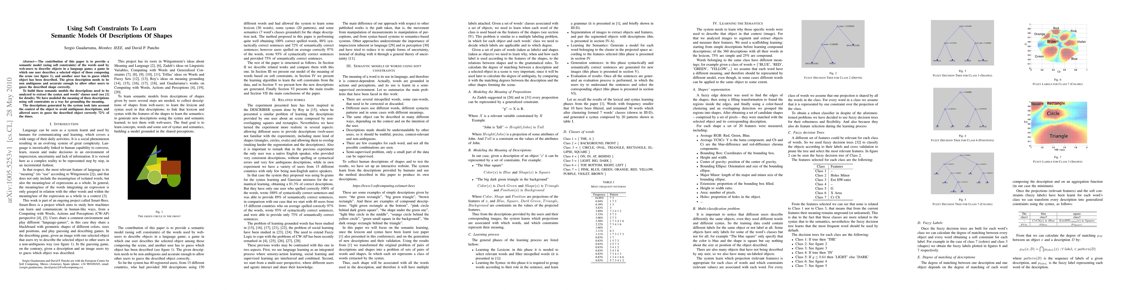 The contribution of this paper is to provide a semantic model (using soft constraints) of the words used by web-users to describe objects in a language game; a game in which one user describes a selected object of those composing the scene, and another user has to guess which object has been described. The given description needs to be non ambiguous and accurate enough to allow other users to guess the described shape correctly. To build these semantic models the descriptions need to be analyzed to extract the syntax and words' classes used. We have modeled the meaning of these descriptions using soft constraints as a way for grounding the meaning. The descriptions generated by the system took into account the context of the object to avoid ambiguous descriptions, and allowed users to guess the described object correctly 72% of the times.