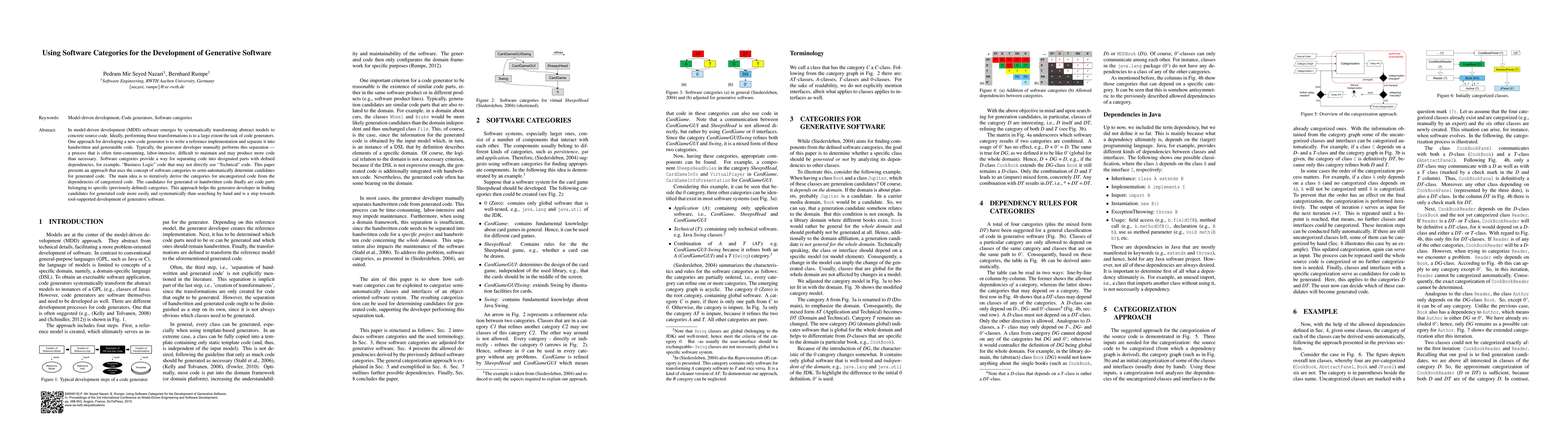 This paper proposes a semi-automatic method using software categories to identify candidates for generated code in model-driven development, aiming to streamline the separation process from manual effort. The approach iteratively derives categories from dependencies, aiding developers in finding suitable code parts for generation.