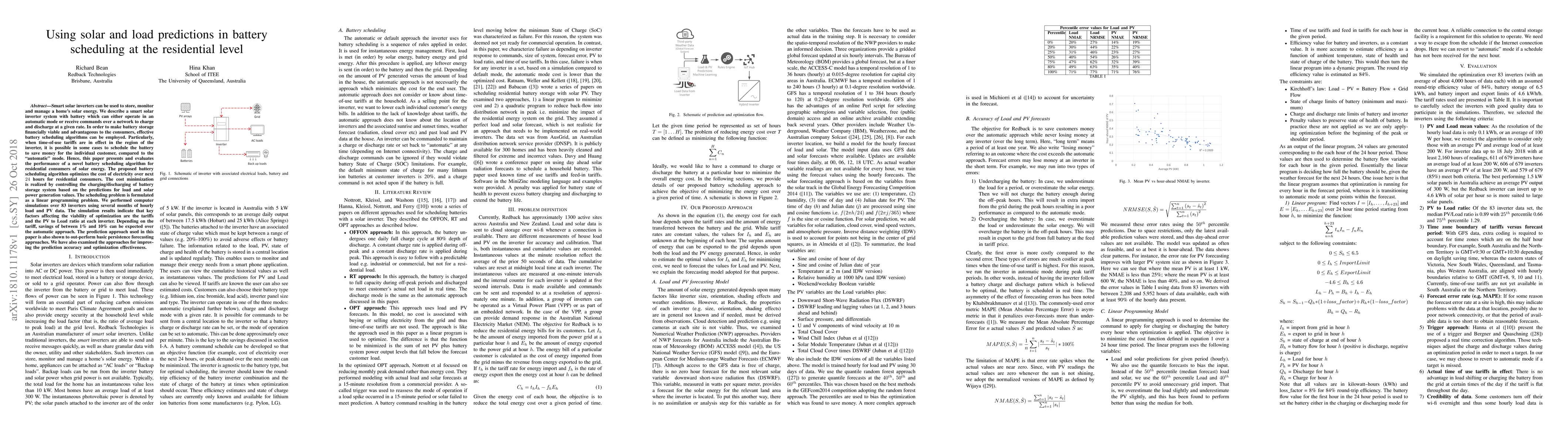 Smart solar inverters can be used to store, monitor and manage a home's solar energy. We describe a smart solar inverter system with battery which can either operate in an automatic mode or receive commands over a network to charge and discharge at a given rate. In order to make battery storage financially viable and advantageous to the consumers, effective battery scheduling algorithms can be employed. Particularly, when time-of-use tariffs are in effect in the region of the inverter, it is possible in some cases to schedule the battery to save money for the individual customer, compared to the "automatic" mode. Hence, this paper presents and evaluates the performance of a novel battery scheduling algorithm for residential consumers of solar energy. The proposed battery scheduling algorithm optimizes the cost of electricity over next 24 hours for residential consumers. The cost minimization is realized by controlling the charging/discharging of battery storage system based on the predictions for load and solar power generation values. The scheduling problem is formulated as a linear programming problem. We performed computer simulations over 83 inverters using several months of hourly load and PV data. The simulation results indicate that key factors affecting the viability of optimization are the tariffs and the PV to Load ratio at each inverter. Depending on the tariff, savings of between 1% and 10% can be expected over the automatic approach. The prediction approach used in this paper is also shown to out-perform basic "persistence" forecasting approaches. We have also examined the approaches for improving the prediction accuracy and optimization effectiveness.