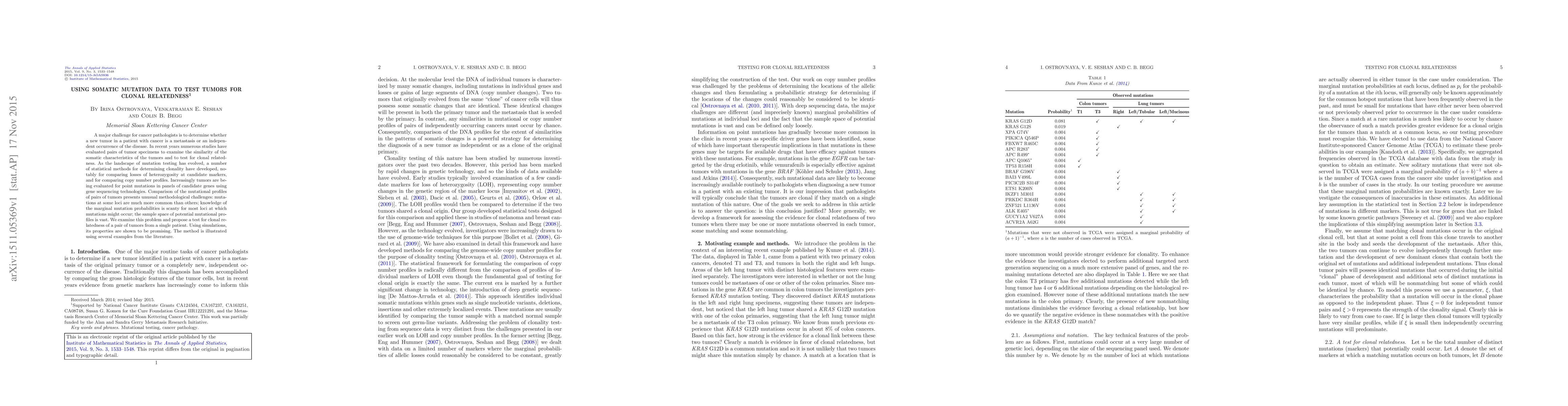 This paper proposes a statistical test to determine clonal relatedness between tumors in cancer patients, addressing the challenge of distinguishing metastases from independent occurrences. The method evaluates somatic mutation data, particularly point mutations, and is shown to be effective through simulations and examples from existing studies.