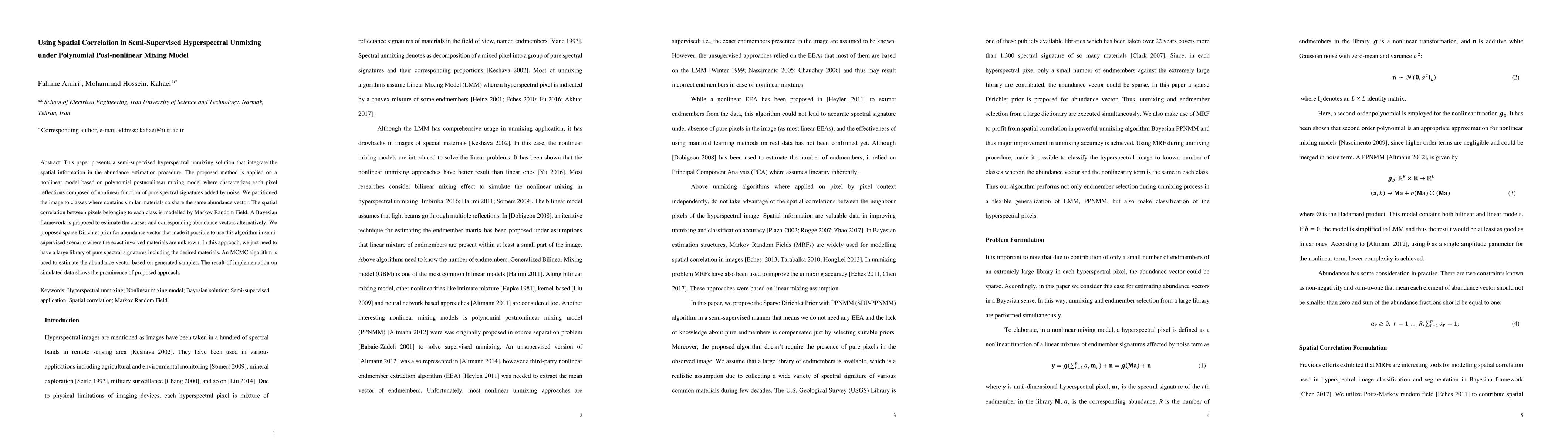 This paper presents a semi-supervised hyperspectral unmixing solution that integrate the spatial information in the abundance estimation procedure. The proposed method is applied on a nonlinear model based on polynomial postnonlinear mixing model where characterizes each pixel reflections composed of nonlinear function of pure spectral signatures added by noise. We partitioned the image to classes where contains similar materials so share the same abundance vector. The spatial correlation between pixels belonging to each class is modelled by Markov Random Field. A Bayesian framework is proposed to estimate the classes and corresponding abundance vectors alternatively. We proposed sparse Dirichlet prior for abundance vector that made it possible to use this algorithm in semi-supervised scenario where the exact involved materials are unknown. In this approach, we just need to have a large library of pure spectral signatures including the desired materials. An MCMC algorithm is used to estimate the abundance vector based on generated samples. The result of implementation on simulated data shows the prominence of proposed approach.