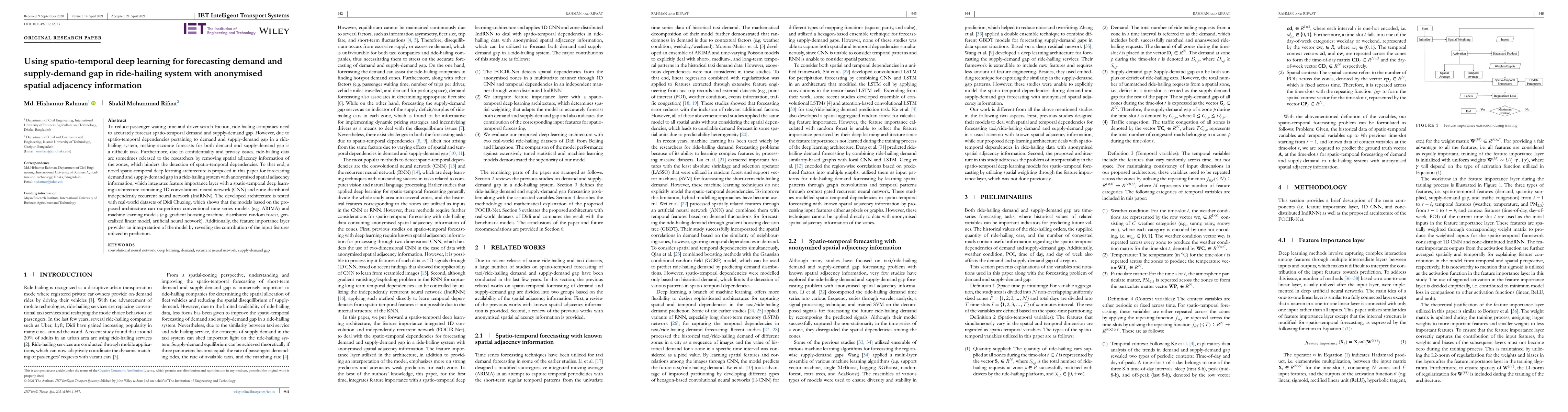This paper proposes a novel spatio-temporal deep learning architecture to forecast demand and supply-demand gap in ride-hailing systems using anonymized spatial adjacency information. The proposed model integrates a feature importance layer with a CNN and IndRNN, outperforming conventional time-series and machine learning models, while also providing interpretability through feature importance analysis.