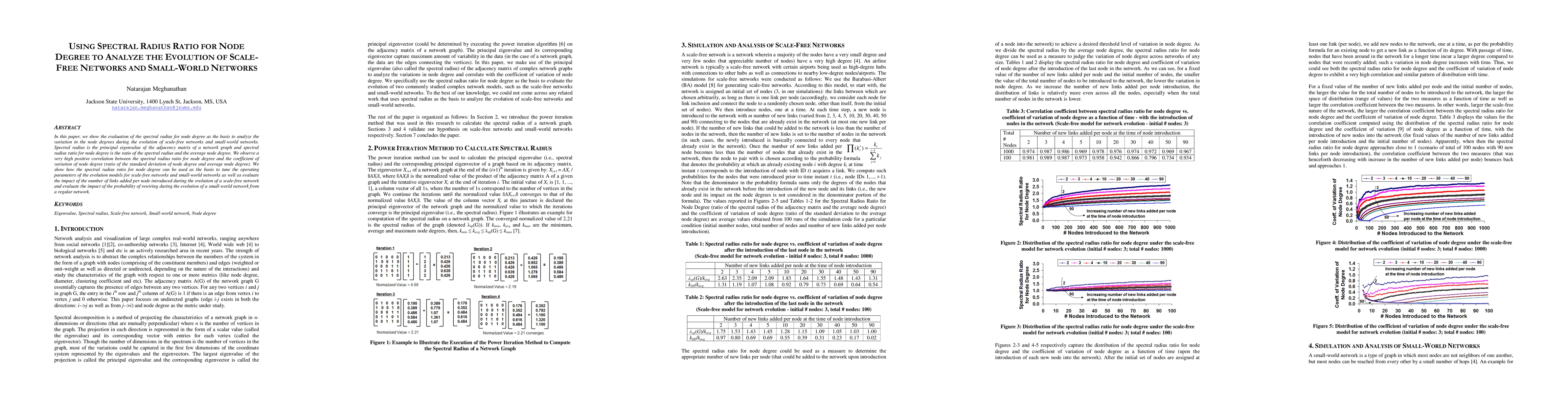 This paper evaluates the spectral radius ratio for node degree to analyze the evolution of scale-free and small-world networks, finding a high correlation between this ratio and the coefficient of variation of node degree. It demonstrates the use of this ratio to tune the parameters of network evolution models.