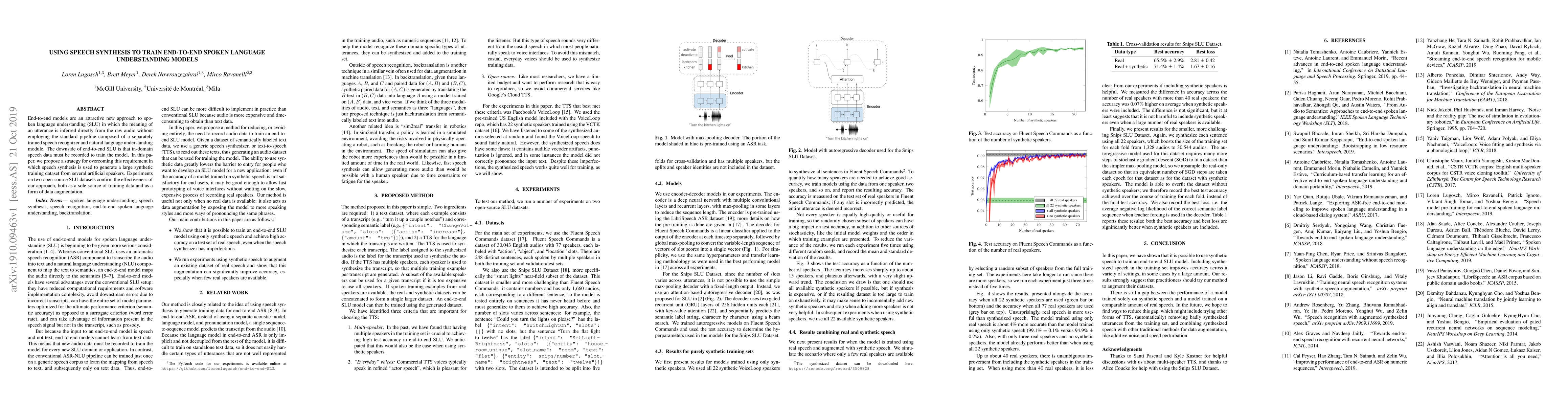 This paper proposes using speech synthesis to create synthetic training data for end-to-end spoken language understanding models, which eliminates the need for in-domain speech recordings. Experiments show the method's effectiveness both as a primary training source and for augmenting existing datasets.