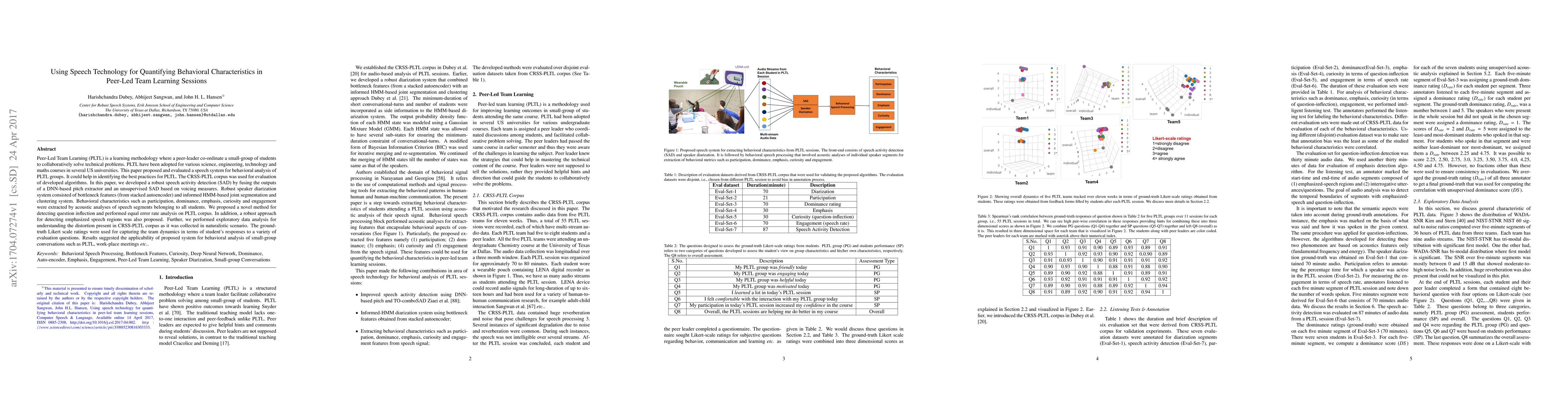 Peer-Led Team Learning (PLTL) is a learning methodology where a peer-leader co-ordinate a small-group of students to collaboratively solve technical problems. PLTL have been adopted for various science, engineering, technology and maths courses in several US universities. This paper proposed and evaluated a speech system for behavioral analysis of PLTL groups. It could help in identifying the best practices for PLTL. The CRSS-PLTL corpus was used for evaluation of developed algorithms. In this paper, we developed a robust speech activity detection (SAD) by fusing the outputs of a DNN-based pitch extractor and an unsupervised SAD based on voicing measures. Robust speaker diarization system consisted of bottleneck features (from stacked autoencoder) and informed HMM-based joint segmentation and clustering system. Behavioral characteristics such as participation, dominance, emphasis, curiosity and engagement were extracted by acoustic analyses of speech segments belonging to all students. We proposed a novel method for detecting question inflection and performed equal error rate analysis on PLTL corpus. In addition, a robust approach for detecting emphasized speech regions was also proposed. Further, we performed exploratory data analysis for understanding the distortion present in CRSS-PLTL corpus as it was collected in naturalistic scenario. The ground-truth Likert scale ratings were used for capturing the team dynamics in terms of student's responses to a variety of evaluation questions. Results suggested the applicability of proposed system for behavioral analysis of small-group conversations such as PLTL, work-place meetings etc.. Keywords- Behavioral Speech Processing, Bottleneck Features, Curiosity, Deep Neural Network, Dominance, Auto-encoder, Emphasis, Engagement, Peer-Led Team Learning, Speaker Diarization, Small-group Conversations