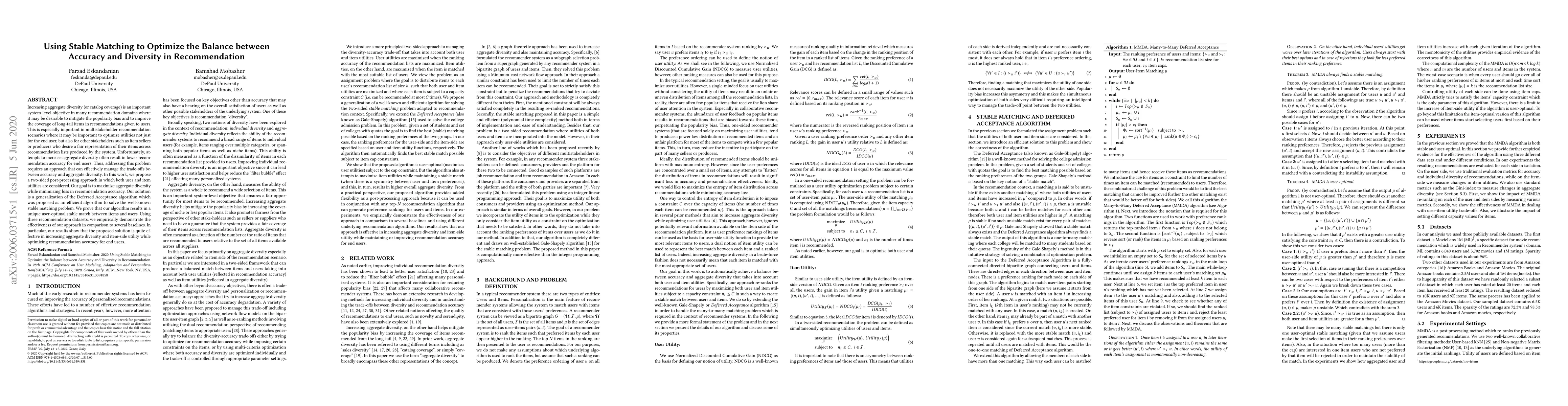 This research proposes a method using a modified Deferred Acceptance algorithm to balance recommendation accuracy and diversity, ensuring fair representation of items for stakeholders like sellers. The approach maximizes aggregate diversity while minimizing accuracy loss, demonstrated to be effective on three datasets, improving both item-side utility and user satisfaction.