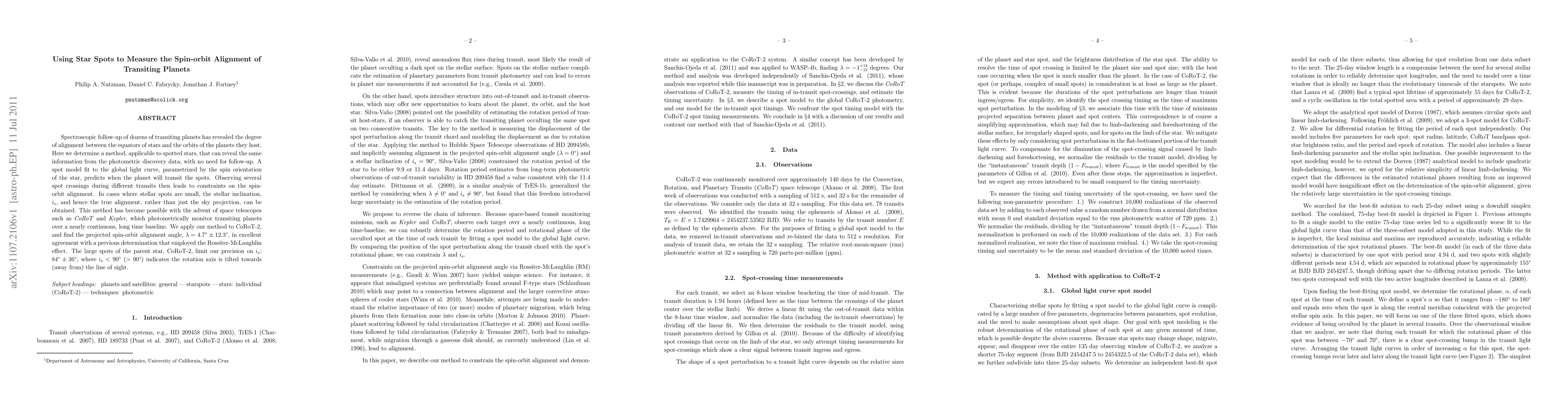 Spectroscopic follow-up of dozens of transiting planets has revealed the degree of alignment between the equators of stars and the orbits of the planets they host. Here we determine a method, applicable to spotted stars, that can reveal the same information from the photometric discovery data, with no need for follow-up. A spot model fit to the global light curve, parametrized by the spin orientation of the star, predicts when the planet will transit the spots. Observing several spot crossings during different transits then leads to constraints on the spin-orbit alignment. In cases where stellar spots are small, the stellar inclination, and hence the true alignment, rather than just the sky projection, can be obtained. This method has become possible with the advent of space telescopes such as CoRoT and Kepler, which photometrically monitor transiting planets over a nearly continuous, long time baseline. We apply our method to CoRoT-2, and find the projected spin-orbit alignment angle, lambda= 4.7 deg +/- 12.3 deg, in excellent agreement with a previous determination that employed the Rossiter-McLaughlin effect. The large spots of the parent star, CoRoT-2, limit our precision on the stellar inclination: i_s = 84 deg +/- 36 deg, where i_s < 90 deg (> 90 deg) indicates the rotation axis is tilted towards (away from) the line of sight.