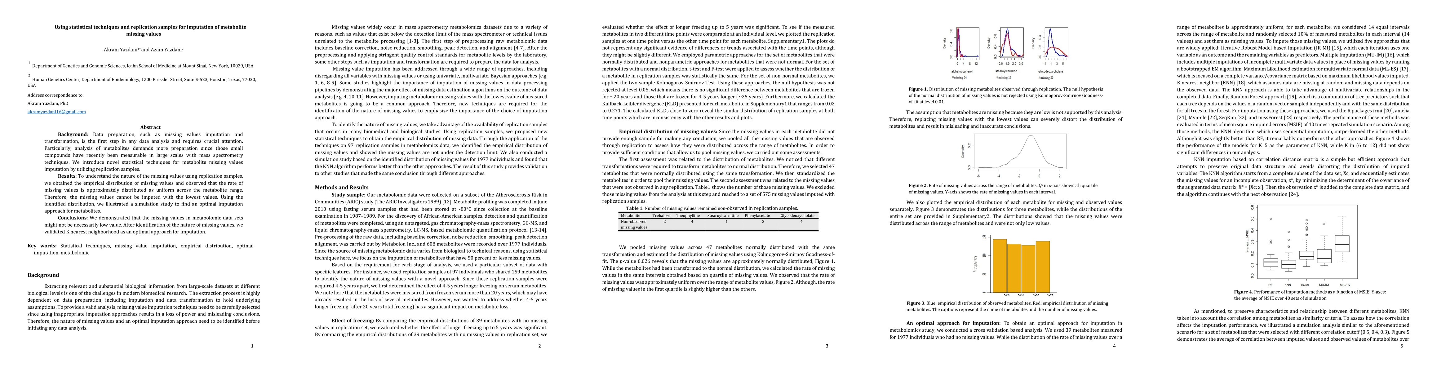 This paper introduces statistical techniques for imputing missing values in metabolomic data using replication samples, finding that missing values are uniformly distributed and thus cannot be imputed with the lowest values. The study concludes that K nearest neighborhood is an optimal imputation method.