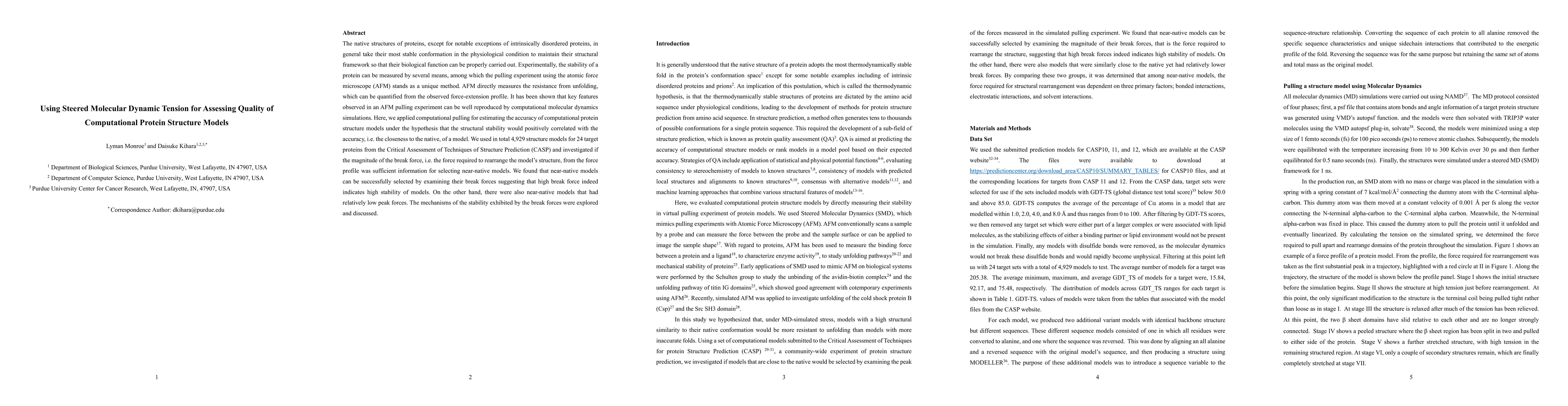 The native structures of proteins, except for notable exceptions of intrinsically disordered proteins, in general take their most stable conformation in the physiological condition to maintain their structural framework so that their biological function can be properly carried out. Experimentally, the stability of a protein can be measured by several means, among which the pulling experiment using the atomic force microscope (AFM) stands as a unique method. AFM directly measures the resistance from unfolding, which can be quantified from the observed force-extension profile. It has been shown that key features observed in an AFM pulling experiment can be well reproduced by computational molecular dynamics simulations. Here, we applied computational pulling for estimating the accuracy of computational protein structure models under the hypothesis that the structural stability would positively correlated with the accuracy, i.e. the closeness to the native, of a model. We used in total 4,929 structure models for 24 target proteins from the Critical Assessment of Techniques of Structure Prediction (CASP) and investigated if the magnitude of the break force, i.e., the force required to rearrange the model structure, from the force profile was sufficient information for selecting near-native models. We found that near-native models can be successfully selected by examining their break forces suggesting that high break force indeed indicates high stability of models. On the other hand, there were also near-native models that had relatively low peak forces. The mechanisms of the stability exhibited by the break forces were explored and discussed.