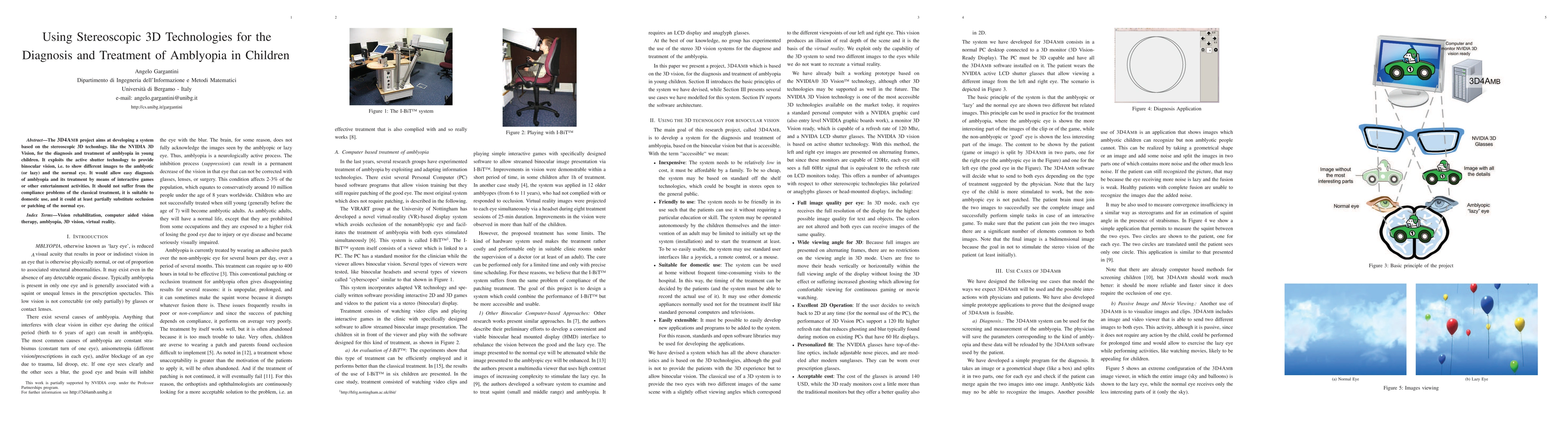 The 3D4Amb project aims at developing a system based on the stereoscopic 3D techonlogy, like the NVIDIA 3D Vision, for the diagnosis and treatment of amblyopia in young children. It exploits the active shutter technology to provide binocular vision, i.e. to show different images to the amblyotic (or lazy) and the normal eye. It would allow easy diagnosis of amblyopia and its treatment by means of interactive games or other entertainment activities. It should not suffer from the compliance problems of the classical treatment, it is suitable to domestic use, and it could at least partially substitute occlusion or patching of the normal eye.