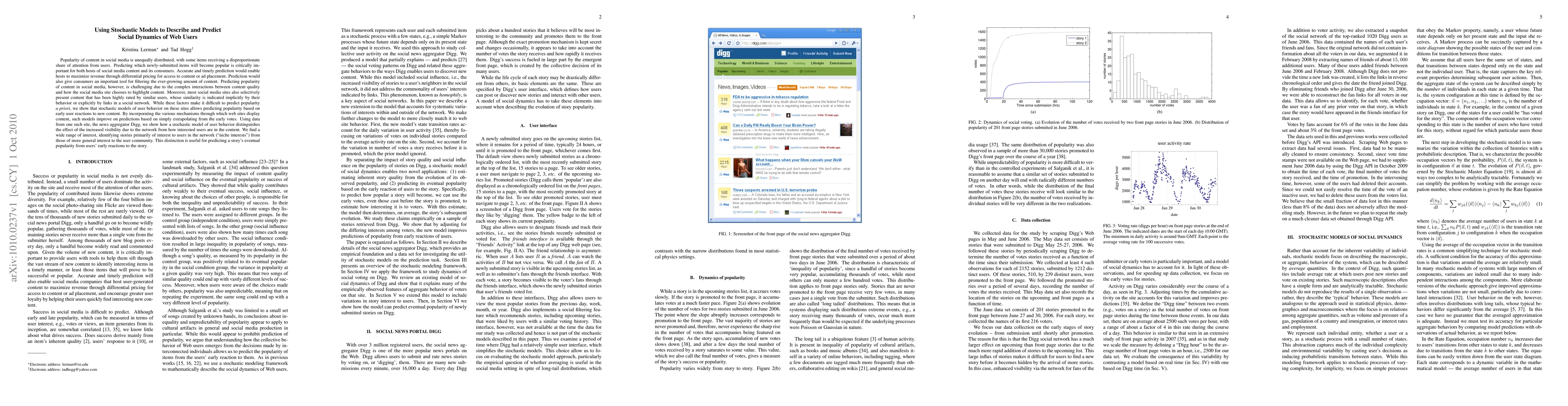 Popularity of content in social media is unequally distributed, with some items receiving a disproportionate share of attention from users. Predicting which newly-submitted items will become popular is critically important for both hosts of social media content and its consumers. Accurate and timely prediction would enable hosts to maximize revenue through differential pricing for access to content or ad placement. Prediction would also give consumers an important tool for filtering the ever-growing amount of content. Predicting popularity of content in social media, however, is challenging due to the complex interactions between content quality and how the social media site chooses to highlight content. Moreover, most social media sites also selectively present content that has been highly rated by similar users, whose similarity is indicated implicitly by their behavior or explicitly by links in a social network. While these factors make it difficult to predict popularity \emph{a priori}, we show that stochastic models of user behavior on these sites allows predicting popularity based on early user reactions to new content. By incorporating the various mechanisms through which web sites display content, such models improve on predictions based on simply extrapolating from the early votes. Using data from one such site, the news aggregator Digg, we show how a stochastic model of user behavior distinguishes the effect of the increased visibility due to the network from how interested users are in the content. We find a wide range of interest, identifying stories primarily of interest to users in the network (``niche interests'') from those of more general interest to the user community. This distinction is useful for predicting a story's eventual popularity from users' early reactions to the story.