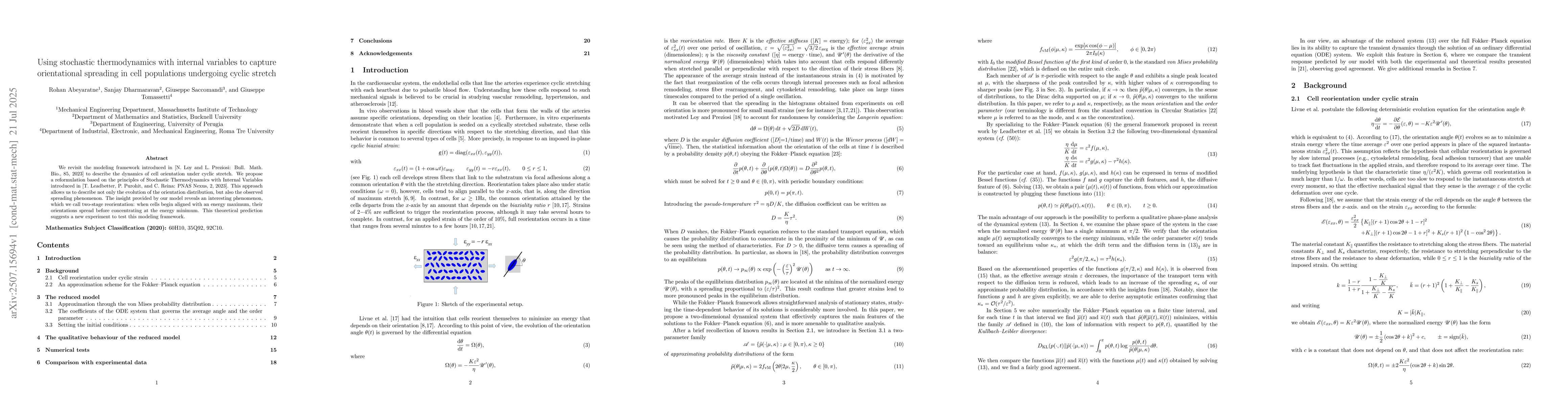 We revisit the modeling framework introduced in [N. Loy and L. Preziosi: Bull. Math. Bio., 85, 2023] to describe the dynamics of cell orientation under cyclic stretch. We propose a reformulation based on the principles of Stochastic Thermodynamics with Internal Variables introduced in [T. Leadbetter, P. Purohit, and C. Reina: PNAS Nexus, 2, 2023]. This approach allows us to describe not only the evolution of the orientation distribution, but also the observed spreading phenomenon. The insight provided by our model reveals an interesting phenomenon, which we call two-stage reorientation: when cells begin aligned with an energy maximum, their orientations spread before concentrating at the energy minimum. This theoretical prediction suggests a new experiment to test this modeling framework.