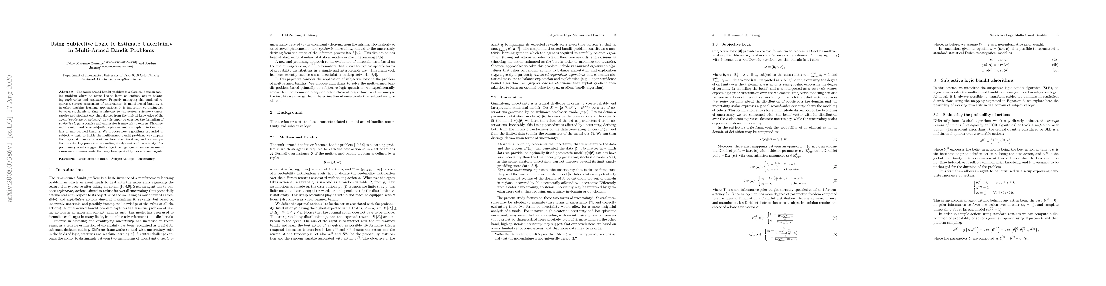 This paper proposes new algorithms based on subjective logic to manage uncertainty in multi-armed bandit problems, distinguishing between aleatoric and epistemic uncertainty. Preliminary results indicate that subjective logic can provide a useful assessment of uncertainty, potentially leading to more refined decision-making strategies.