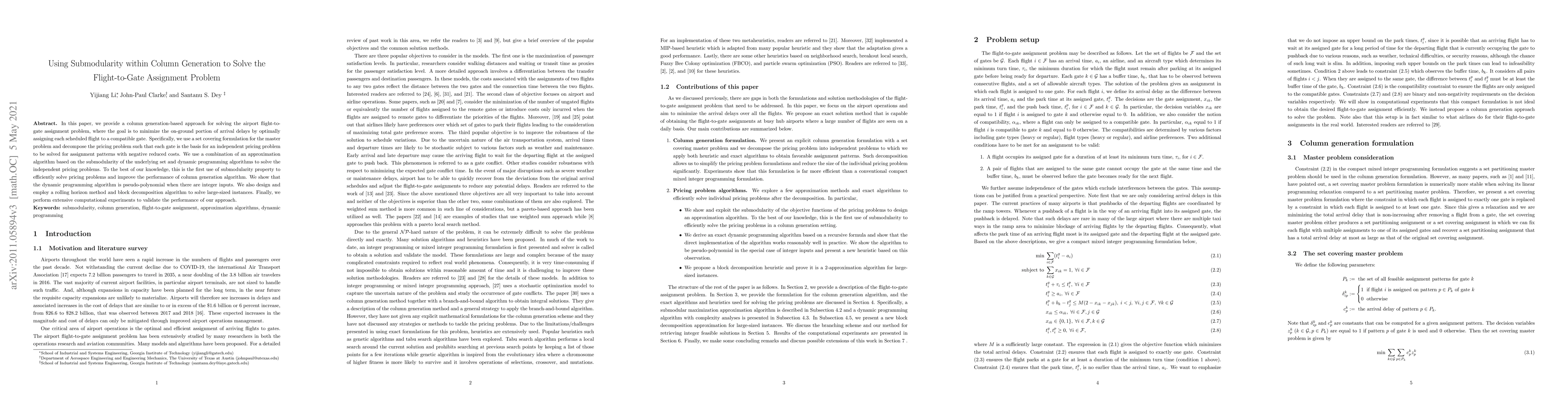 This paper presents a column generation approach for the flight-to-gate assignment problem, utilizing submodularity and dynamic programming to optimize gate assignments and minimize arrival delays. The method employs a rolling horizon and block decomposition for scalability, validated through extensive computational experiments.