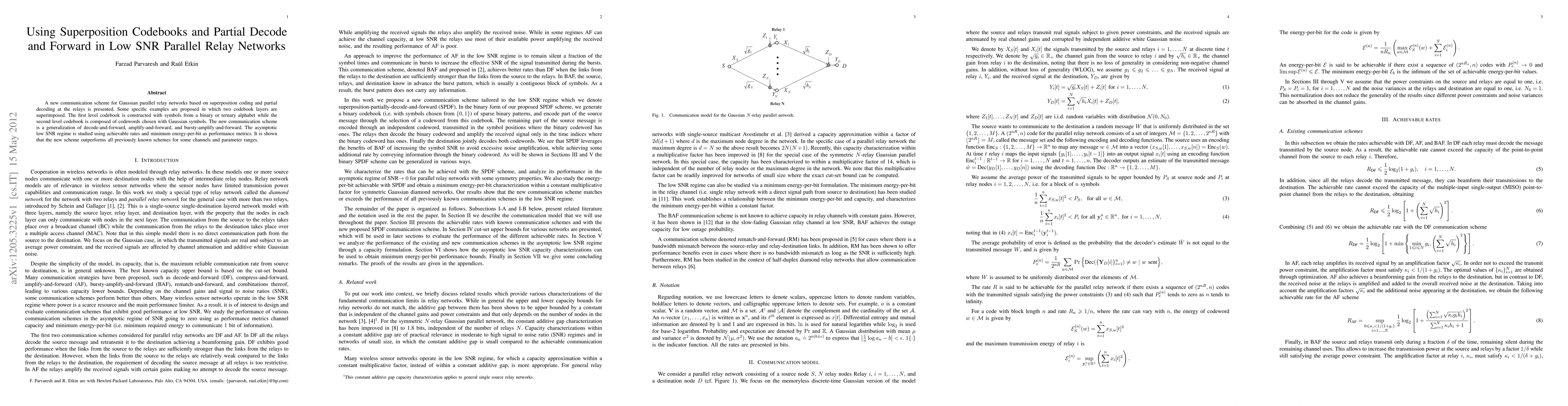 A new communication scheme for Gaussian parallel relay networks based on superposition coding and partial decoding at the relays is presented. Some specific examples are proposed in which two codebook layers are superimposed. The first level codebook is constructed with symbols from a binary or ternary alphabet while the second level codebook is composed of codewords chosen with Gaussian symbols. The new communication scheme is a generalization of decode-and-forward, amplify-and-forward, and bursty-amplify-and-forward. The asymptotic low SNR regime is studied using achievable rates and minimum energy-per-bit as performance metrics. It is shown that the new scheme outperforms all previously known schemes for some channels and parameter ranges.