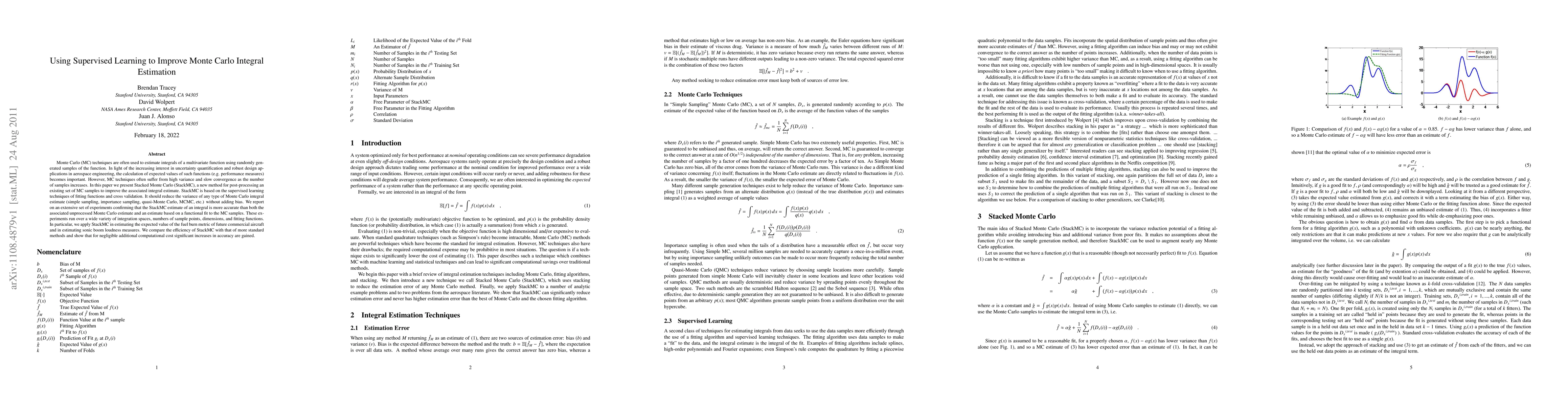 Monte Carlo (MC) techniques are often used to estimate integrals of a multivariate function using randomly generated samples of the function. In light of the increasing interest in uncertainty quantification and robust design applications in aerospace engineering, the calculation of expected values of such functions (e.g. performance measures) becomes important. However, MC techniques often suffer from high variance and slow convergence as the number of samples increases. In this paper we present Stacked Monte Carlo (StackMC), a new method for post-processing an existing set of MC samples to improve the associated integral estimate. StackMC is based on the supervised learning techniques of fitting functions and cross validation. It should reduce the variance of any type of Monte Carlo integral estimate (simple sampling, importance sampling, quasi-Monte Carlo, MCMC, etc.) without adding bias. We report on an extensive set of experiments confirming that the StackMC estimate of an integral is more accurate than both the associated unprocessed Monte Carlo estimate and an estimate based on a functional fit to the MC samples. These experiments run over a wide variety of integration spaces, numbers of sample points, dimensions, and fitting functions. In particular, we apply StackMC in estimating the expected value of the fuel burn metric of future commercial aircraft and in estimating sonic boom loudness measures. We compare the efficiency of StackMC with that of more standard methods and show that for negligible additional computational cost significant increases in accuracy are gained.