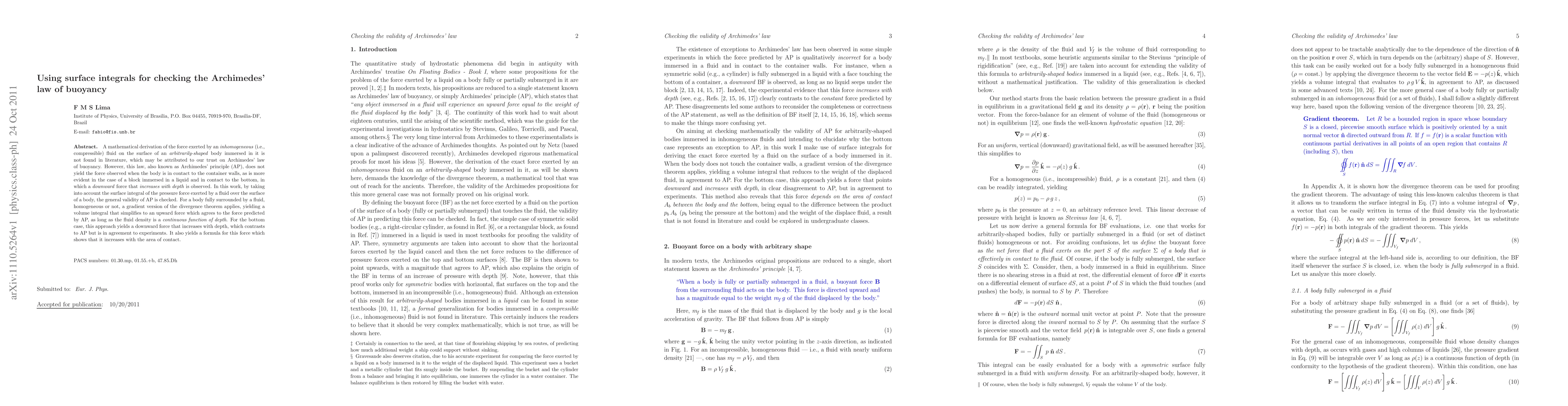 A mathematical derivation of the force exerted by an \emph{inhomogeneous} (i.e., compressible) fluid on the surface of an \emph{arbitrarily-shaped} body immersed in it is not found in literature, which may be attributed to our trust on Archimedes' law of buoyancy. However, this law, also known as Archimedes' principle (AP), does not yield the force observed when the body is in contact to the container walls, as is more evident in the case of a block immersed in a liquid and in contact to the bottom, in which a \emph{downward} force that \emph{increases with depth} is observed. In this work, by taking into account the surface integral of the pressure force exerted by a fluid over the surface of a body, the general validity of AP is checked. For a body fully surrounded by a fluid, homogeneous or not, a gradient version of the divergence theorem applies, yielding a volume integral that simplifies to an upward force which agrees to the force predicted by AP, as long as the fluid density is a \emph{continuous function of depth}. For the bottom case, this approach yields a downward force that increases with depth, which contrasts to AP but is in agreement to experiments. It also yields a formula for this force which shows that it increases with the area of contact.
