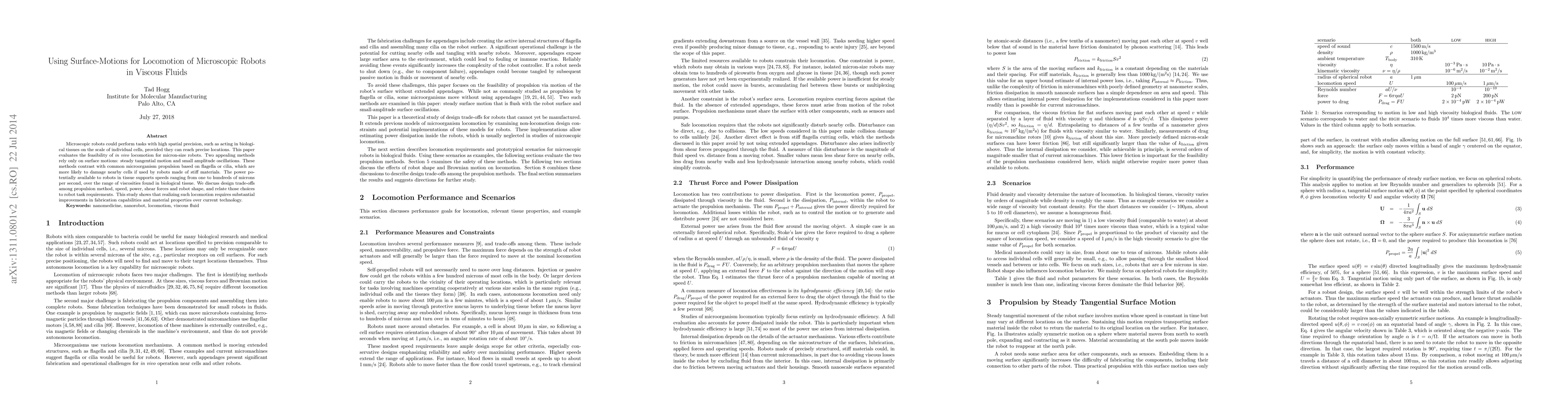 Researchers explored using surface-motions to propel microscopic robots in viscous fluids, finding that steady tangential motion and small amplitude oscillations can achieve speeds of 1-100 microns per second with minimal cell damage.