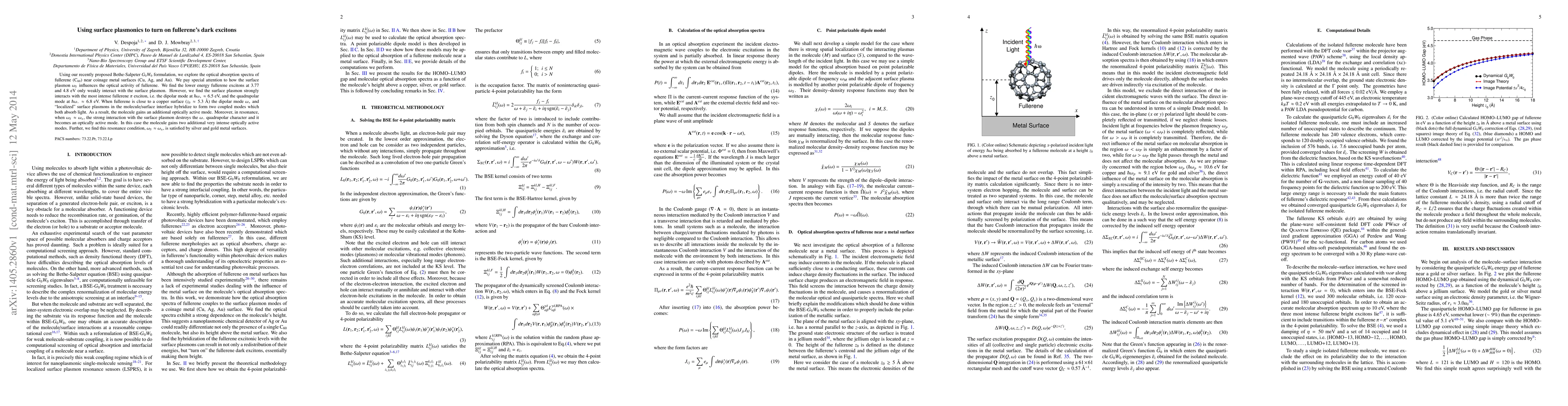 The paper presents a detailed computational framework combining BSE, G0W0, and DFT to model fullerene-metal interactions, offering a robust methodology for predicting optoelectronic enhancements in molecule/substrate systems.