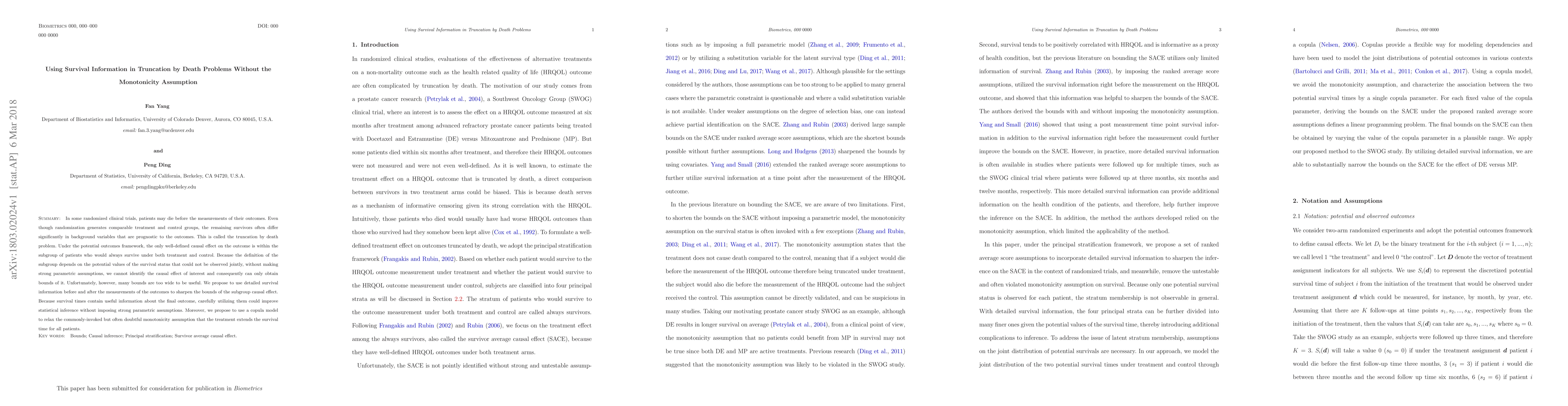 In some randomized clinical trials, patients may die before the measurements of their outcomes. Even though randomization generates comparable treatment and control groups, the remaining survivors often differ significantly in background variables that are prognostic to the outcomes. This is called the truncation by death problem. Under the potential outcomes framework, the only well-defined causal effect on the outcome is within the subgroup of patients who would always survive under both treatment and control. Because the definition of the subgroup depends on the potential values of the survival status that could not be observed jointly, without making strong parametric assumptions, we cannot identify the causal effect of interest and consequently can only obtain bounds of it. Unfortunately, however, many bounds are too wide to be useful. We propose to use detailed survival information before and after the measurements of the outcomes to sharpen the bounds of the subgroup causal effect. Because survival times contain useful information about the final outcome, carefully utilizing them could improve statistical inference without imposing strong parametric assumptions. Moreover, we propose to use a copula model to relax the commonly-invoked but often doubtful monotonicity assumption that the treatment extends the survival time for all patients.