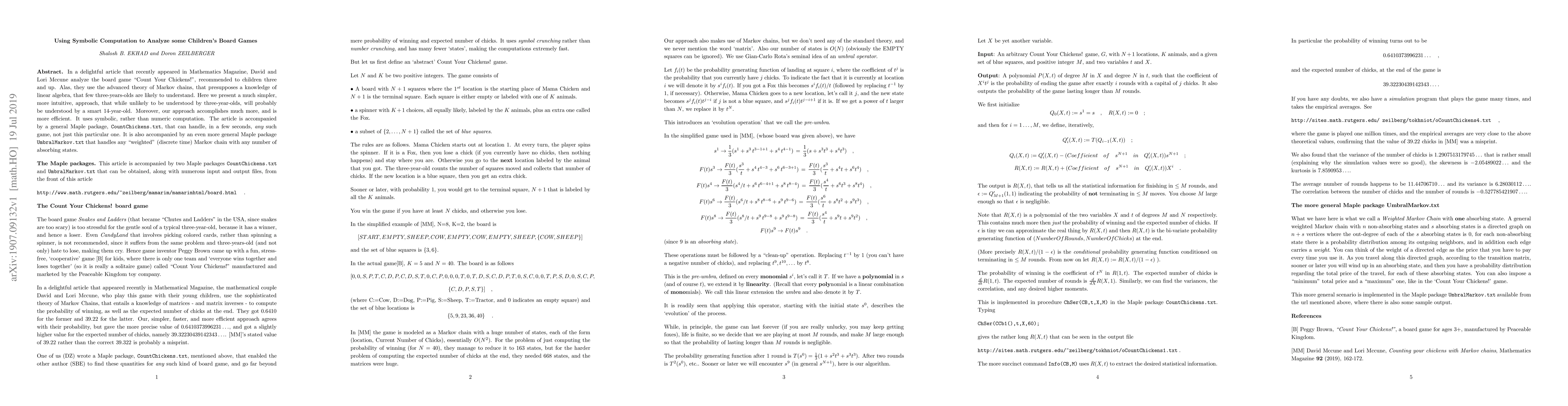 In a delightful article that recently appeared in Mathematics Magazine, David and Lori Mccune analyze the board game "Count Your Chickens!", recommended to children three and up. Alas, they use the advanced theory of Markov chains, that presupposes a knowledge of linear algebra, that few three-years-olds are likely to understand. Here we present a much simpler, more intuitive, approach, that while unlikely to be understood by three-year-olds, will probably be understood by a smart 14-year-old. Moreover, our approach accomplishes much more, and is more efficient. It uses symbolic, rather than numeric computation.
