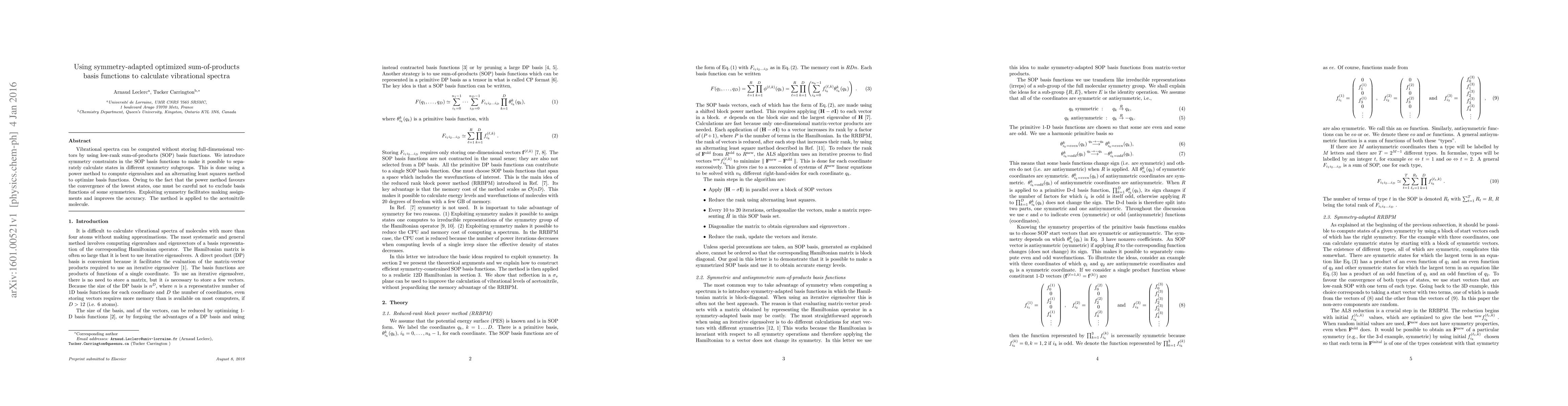 Vibrational spectra can be computed without storing full-dimensional vectors by using low-rank sum-of-products (SOP) basis functions. We introduce symmetry constraints in the SOP basis functions to make it possible to separately calculate states in different symmetry subgroups. This is done using a power method to compute eigenvalues and an alternating least squares method to optimize basis functions. Owing to the fact that the power method favours the convergence of the lowest states, one must be careful not to exclude basis functions of some symmetries. Exploiting symmetry facilitates making assignments and improves the accuracy. The method is applied to the acetonitrile molecule.