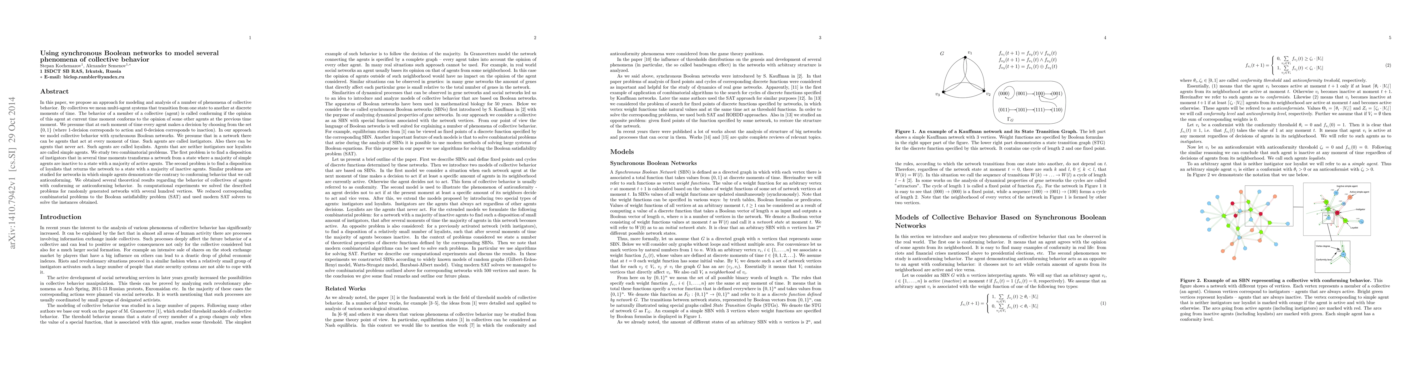 In this paper, we propose an approach for modeling and analysis of a number of phenomena of collective behavior. By collectives we mean multi-agent systems that transition from one state to another at discrete moments of time. The behavior of a member of a collective (agent) is called conforming if the opinion of this agent at current time moment conforms to the opinion of some other agents at the previous time moment. We presume that at each moment of time every agent makes a decision by choosing from the set {0,1} (where 1-decision corresponds to action and 0-decision corresponds to inaction). In our approach we model collective behavior with synchronous Boolean networks. We presume that in a network there can be agents that act at every moment of time. Such agents are called instigators. Also there can be agents that never act. Such agents are called loyalists. Agents that are neither instigators nor loyalists are called simple agents. We study two combinatorial problems. The first problem is to find a disposition of instigators that in several time moments transforms a network from a state where a majority of simple agents are inactive to a state with a majority of active agents. The second problem is to find a disposition of loyalists that returns the network to a state with a majority of inactive agents. Similar problems are studied for networks in which simple agents demonstrate the contrary to conforming behavior that we call anticonforming. We obtained several theoretical results regarding the behavior of collectives of agents with conforming or anticonforming behavior. In computational experiments we solved the described problems for randomly generated networks with several hundred vertices. We reduced corresponding combinatorial problems to the Boolean satisfiability problem (SAT) and used modern SAT solvers to solve the instances obtained.