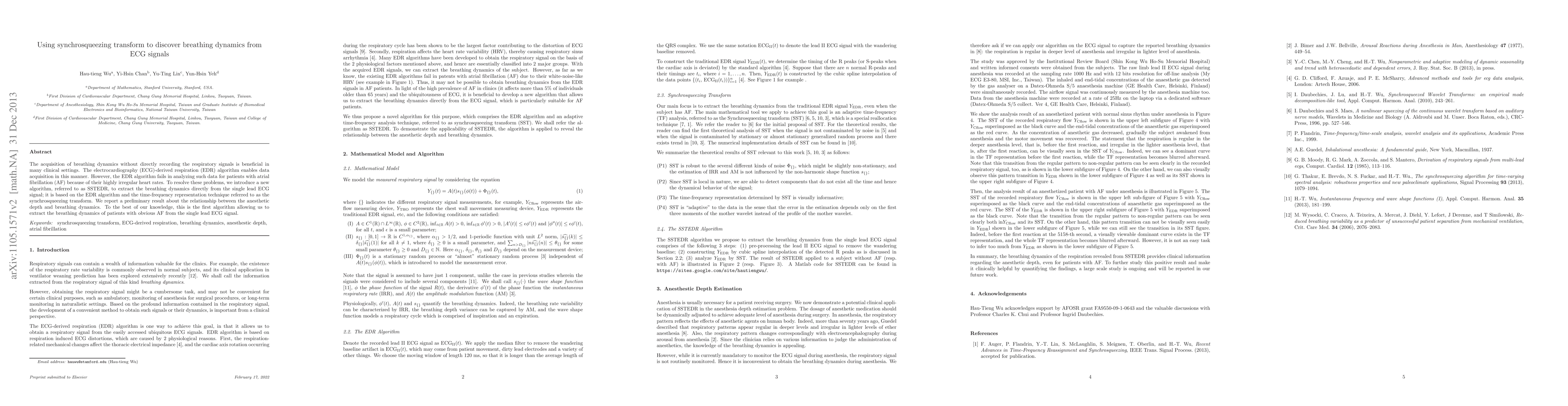 The acquisition of breathing dynamics without directly recording the respiratory signals is beneficial in many clinical settings. The electrocardiography (ECG)-derived respiration (EDR) algorithm enables data acquisition in this manner. However, the EDR algorithm fails in analyzing such data for patients with atrial fibrillation (AF) because of their highly irregular heart rates. To resolve these problems, we introduce a new algorithm, referred to as SSTEDR, to extract the breathing dynamics directly from the single lead ECG signal; it is based on the EDR algorithm and the time-frequency representation technique referred to as the synchrosqueezing transform. We report a preliminary result about the relationship between the anesthetic depth and breathing dynamics. To the best of our knowledge, this is the first algorithm allowing us to extract the breathing dynamics of patients with obvious AF from the single lead ECG signal.