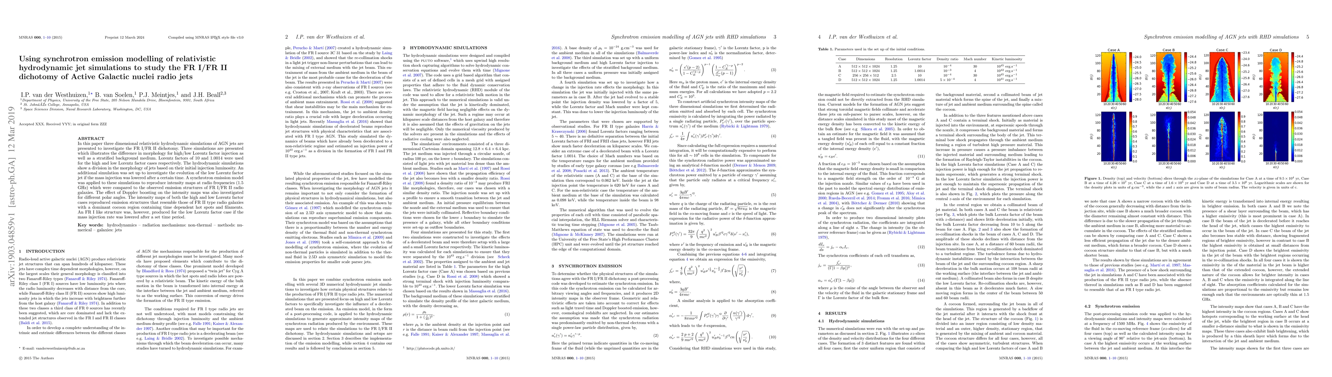 This paper uses relativistic hydrodynamic simulations to explore the FR I/FR II dichotomy of AGN radio jets, finding that high Lorentz factor jets produce FR II-like structures, while low Lorentz factor jets can transition to FR I-like structures if mass injection is reduced. Synchrotron emission models at 1.5 GHz match observed radio galaxy emissions.