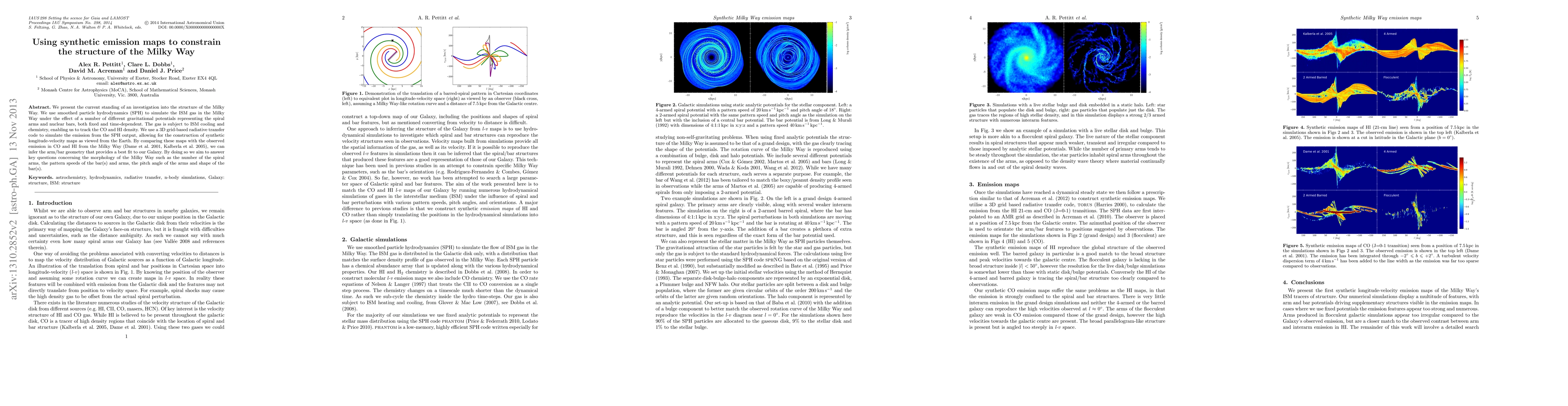 We present the current standing of an investigation into the structure of the Milky Way. We use smoothed particle hydrodynamics (SPH) to simulate the ISM gas in the Milky Way under the effect of a number of different gravitational potentials representing the spiral arms and nuclear bars, both fixed and time-dependent. The gas is subject to ISM cooling and chemistry, enabling us to track the CO and HI density. We use a 3D grid-based radiative transfer code to simulate the emission from the SPH output, allowing for the construction of synthetic longitude-velocity maps as viewed from the Earth. By comparing these maps with the observed emission in CO and HI from the Milky Way (Dame et al. 2001, Kalberla et al. 2005), we can infer the arm/bar geometry that provides a best fit to our Galaxy. By doing so we aim to answer key questions concerning the morphology of the Milky Way such as the number of the spiral arms, the pattern speeds of the bar(s) and arms, the pitch angle of the arms and shape of the bar(s)