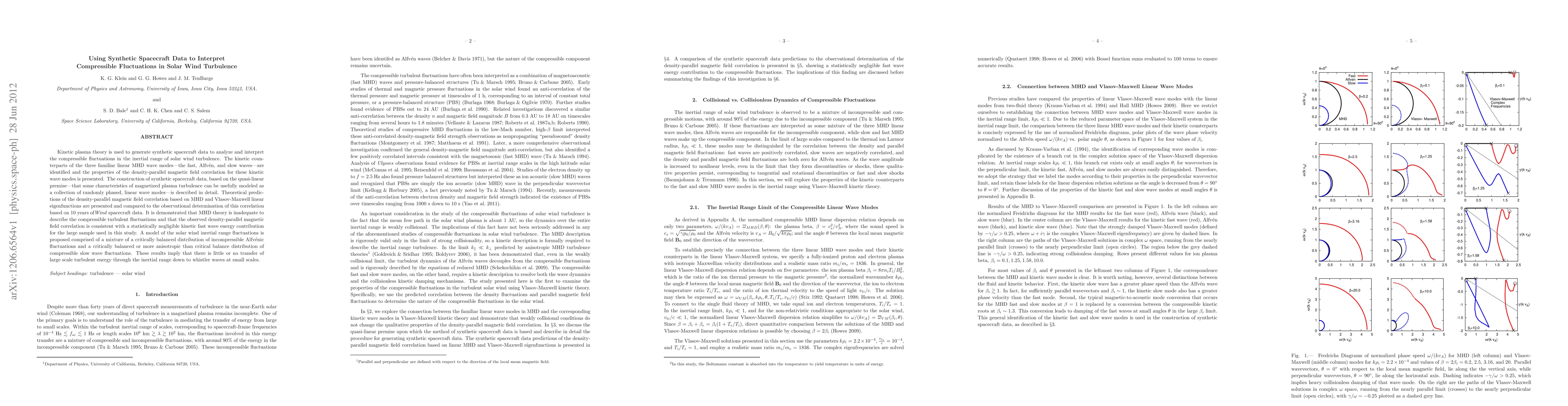 This paper employs synthetic spacecraft data derived from kinetic plasma theory to analyze compressible fluctuations in solar wind turbulence, showing that MHD theory fails to describe these fluctuations. The study proposes a model where solar wind turbulence is composed of a balanced mix of Alfvenic and slow wave fluctuations, indicating minimal energy transfer through the inertial range.