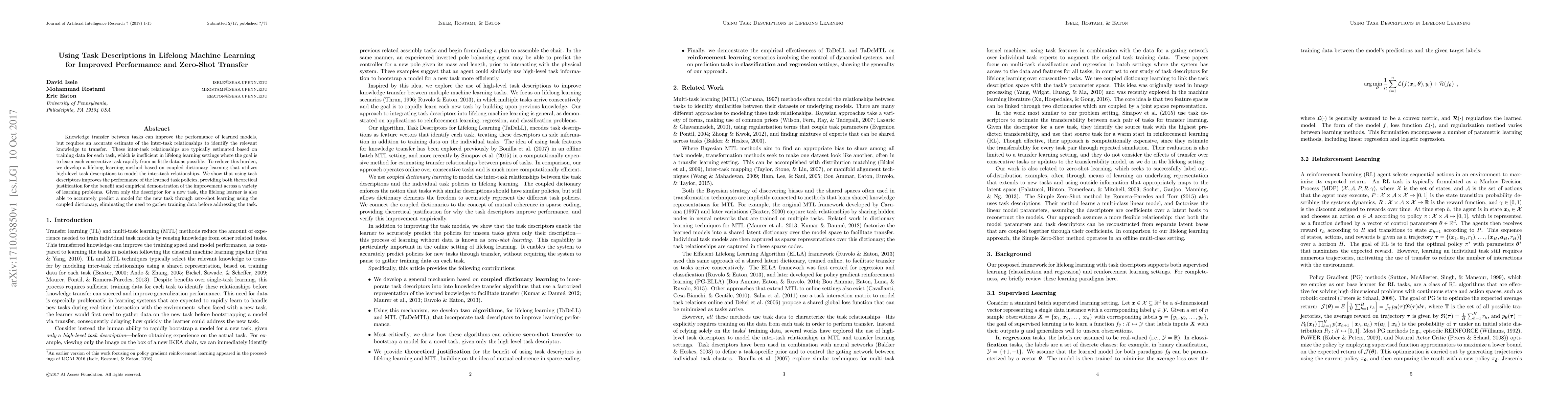 The research proposes a lifelong learning method, TaDeLL, based on coupled dictionary learning that utilizes high-level task descriptions to model inter-task relationships, improving performance and enabling zero-shot transfer for new tasks.
