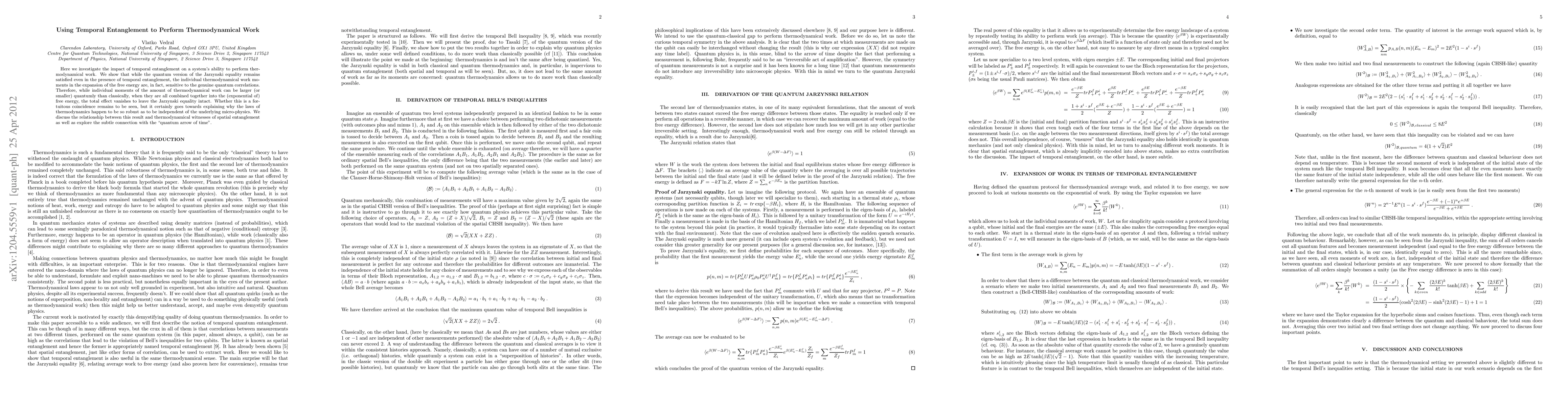 Here we investigate the impact of temporal entanglement on a system's ability to perform thermodynamical work. We show that while the quantum version of the Jarzynski equality remains satisfied even in the presence of temporal entanglement, the individual thermodynamical work moments in the expansion of the free energy are, in fact, sensitive to the genuine quantum correlations. Therefore, while individual moments of the amount of thermodynamical work can be larger (or smaller) quantumly than classically, when they are all combined together into the (exponential of) free energy, the total effect vanishes to leave the Jarzynski equality intact. Whether this is a fortuitous coincidence remains to be seen, but it certainly goes towards explaining why the laws of thermodynamics happen to be so robust as to be independent of the underlying micro-physics. We discuss the relationship between this result and thermodynamical witnesses of spatial entanglement as well as explore the subtle connection with the "quantum arrow of time".