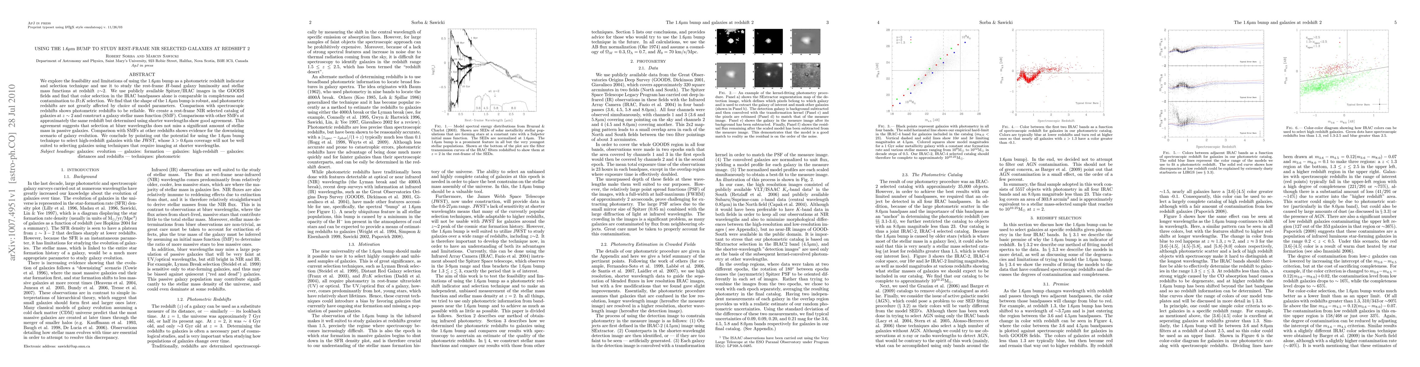 We explore the feasibility and limitations of using the 1.6um bump as a photometric redshift indicator and selection technique and use it to study the rest-frame H-band galaxy luminosity and stellar mass functions at redshift z~2. We use publicly available Spitzer/IRAC images in the GOODS fields and find that color selection in the IRAC bandpasses alone is comparable in completeness and contamination to BzK selection. We find that the shape of the 1.6um bump is robust, and photometric redshifts are not greatly affected by choice of model parameters. Comparison with spectroscopic redshifts shows photometric redshifts to be reliable. We create a rest-frame NIR selected catalog of galaxies at z~2 and construct a galaxy stellar mass function (SMF). Comparisons with other SMFs at approximately the same redshift but determined using shorter wavelengths show good agreement. This agreement suggests that selection at bluer wavelengths does not miss a significant amount of stellar mass in passive galaxies. Comparison with SMFs at other redshifts shows evidence for the downsizing scenario of galaxy evolution. We conclude by pointing out the potential for using the 1.6um technique to select high-redshift galaxies with the JWST, whose lambda > 0.6 um coverage will not be well suited to selecting galaxies using techniques that require imaging at shorter wavelengths.
