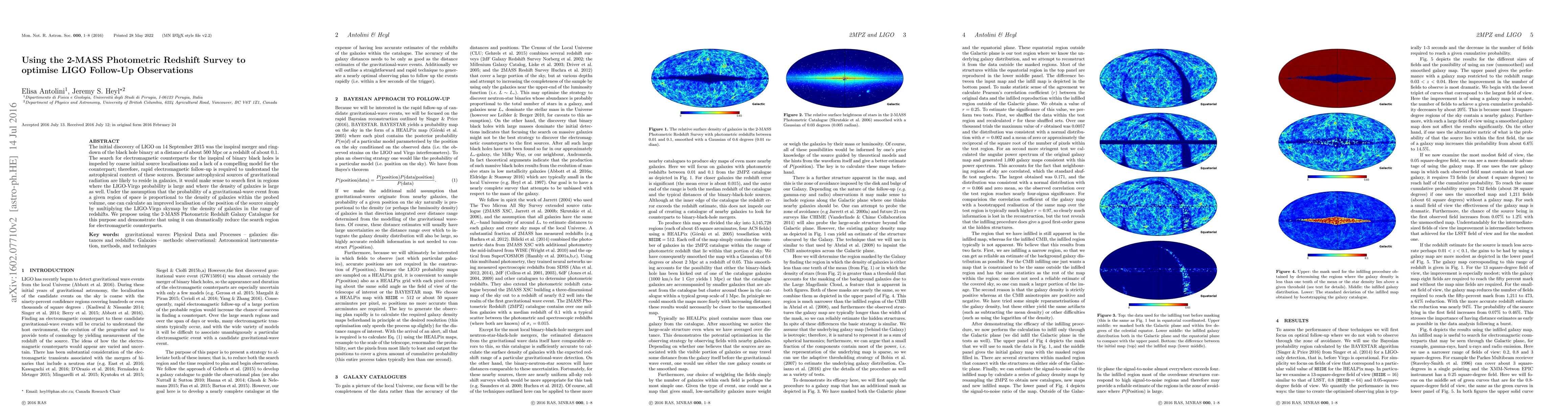 The initial discovery of LIGO on 14 September 2015 was the inspiral merger and ring-down of the black hole binary at a distance of about 500~Mpc or a redshift of about 0.1. The search for electromagnetic counterparts for the inspiral of binary black holes is impeded by coarse initial source localisations and a lack of a compelling model for the counterpart; therefore, rapid electromagnetic follow-up is required to understand the astrophysical context of these sources. Because astrophysical sources of gravitational radiation are likely to reside in galaxies, it would make sense to search first in regions where the LIGO-Virgo probability is large and where the density of galaxies is large as well. Under the assumption that the probability of a gravitational-wave event from a given region of space is proportional to the density of galaxies within the probed volume, one can calculate an improved localisation of the position of the source simply by multiplying the LIGO-Virgo skymap by the density of galaxies in the range of redshifts. We propose using the 2-MASS Photometric Redshift Galaxy Catalogue for this purpose and demonstrate that using it can dramatically reduce the search region for electromagnetic counterparts.