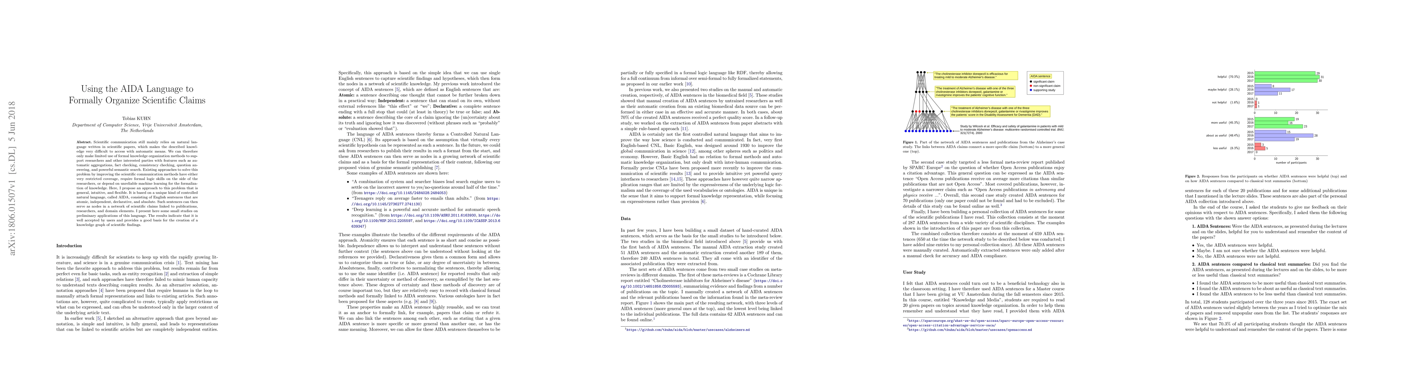 Scientific communication still mainly relies on natural language written in scientific papers, which makes the described knowledge very difficult to access with automatic means. We can therefore only make limited use of formal knowledge organization methods to support researchers and other interested parties with features such as automatic aggregations, fact checking, consistency checking, question answering, and powerful semantic search. Existing approaches to solve this problem by improving the scientific communication methods have either very restricted coverage, require formal logic skills on the side of the researchers, or depend on unreliable machine learning for the formalization of knowledge. Here, I propose an approach to this problem that is general, intuitive, and flexible. It is based on a unique kind of controlled natural language, called AIDA, consisting of English sentences that are atomic, independent, declarative, and absolute. Such sentences can then serve as nodes in a network of scientific claims linked to publications, researchers, and domain elements. I present here some small studies on preliminary applications of this language. The results indicate that it is well accepted by users and provides a good basis for the creation of a knowledge graph of scientific findings.