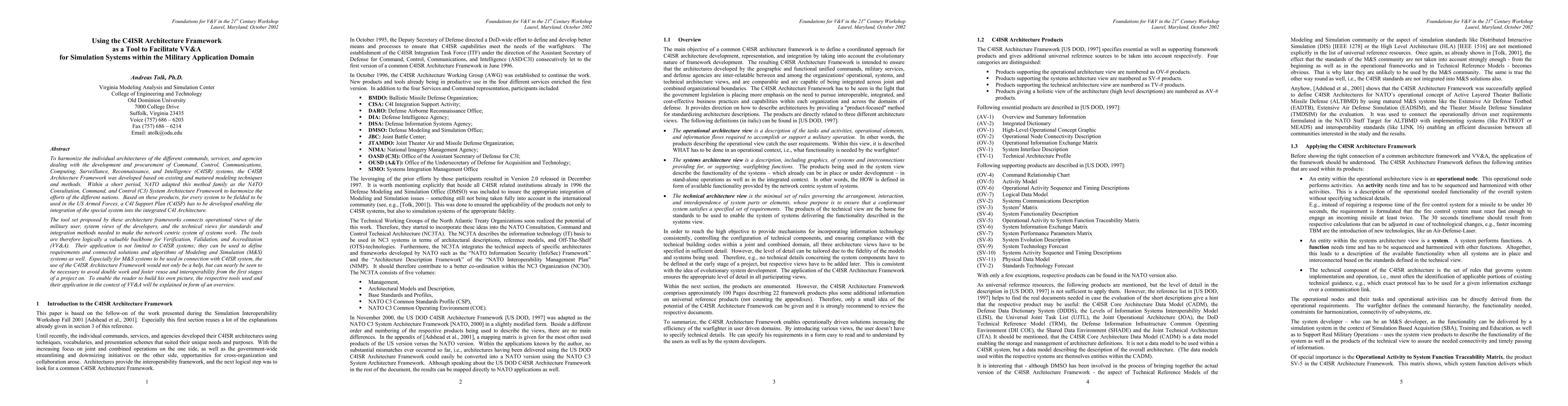 To harmonize the individual architectures of the different commands, services, and agencies dealing with the development and procurement of Command, Control, Communications, Computing, Surveillance, Reconnaissance, and Intelligence (C4ISR) systems, the C4ISR Architecture Framework was developed based on existing and matured modeling techniques and methods. Within a short period, NATO adapted this method family as the NATO Consultation, Command, and Control (C3) System Architecture Framework to harmonize the efforts of the different nations. Based on these products, for every system to be fielded to be used in the US Armed Forces, a C4I Support Plan (C4ISP) has to be developed enabling the integration of the special system into the integrated C4I Architecture. The tool set proposed by these architecture frameworks connects operational views of the military user, system views of the developers, and the technical views for standards and integration methods needed to make the network centric system of systems work. The tools are therefore logically a valuable backbone for Verification, Validation, and Accreditation (VV&A). Their application is not limited to C4ISR systems; they can be used to define requirements and connected solutions and algorithms of Modeling and Simulation (M&S) systems as well. Especially for M&S systems to be used in connection with C4ISR system, the use of the C4ISR Architecture Framework would not only be a help, but can nearly be seen to be necessary to avoid double work and foster reuse and interoperability from the first stages of a project on. To enable the reader to build his own picture, the respective tools used and their application in the context of VV&A will be explained in form of an overview.