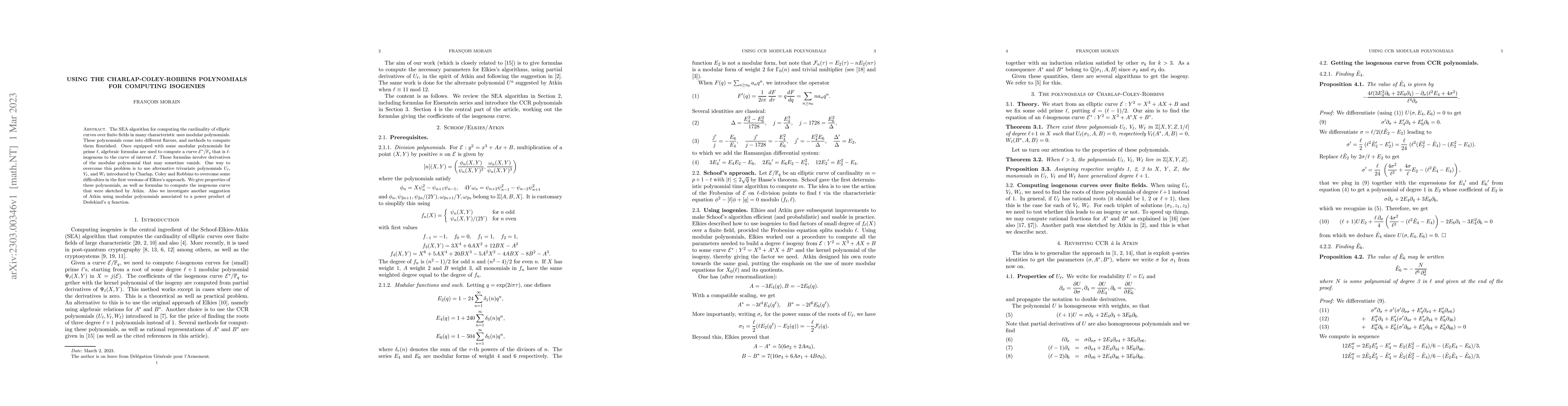 This paper explores the use of Charlap-Coley-Robbins polynomials to compute isogenies between elliptic curves over finite fields. It discusses the properties and formulas of these trivariate polynomials, which offer an alternative to traditional methods involving modular polynomials, and investigates additional suggestions from Atkin for further improvements.