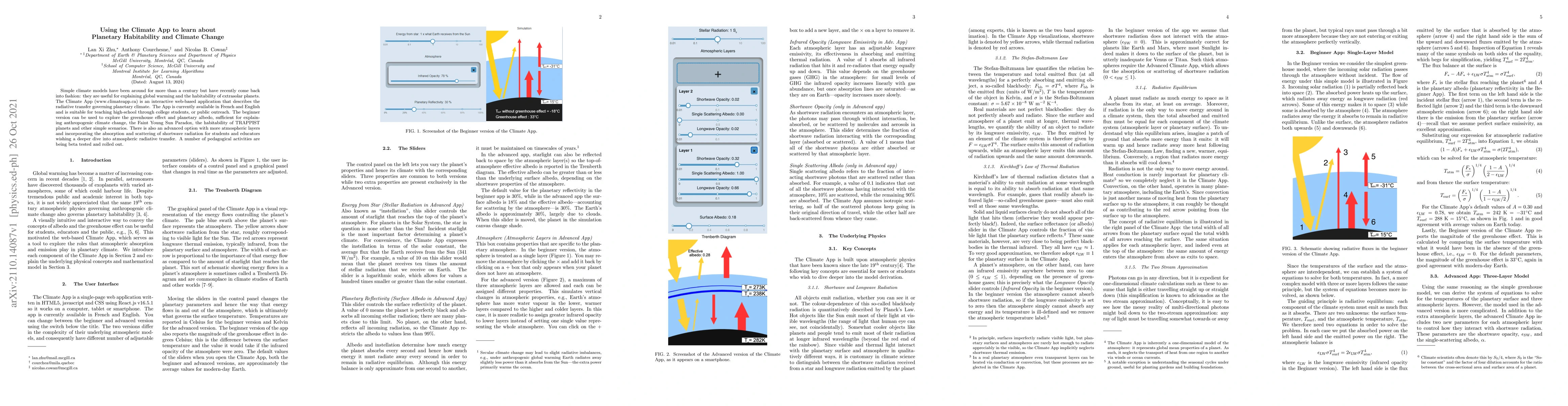 The Climate App is an interactive web-based tool for teaching planetary climate and habitability, suitable for high-school to college students. It offers both beginner and advanced versions to explore topics like the greenhouse effect and atmospheric radiative transfer.