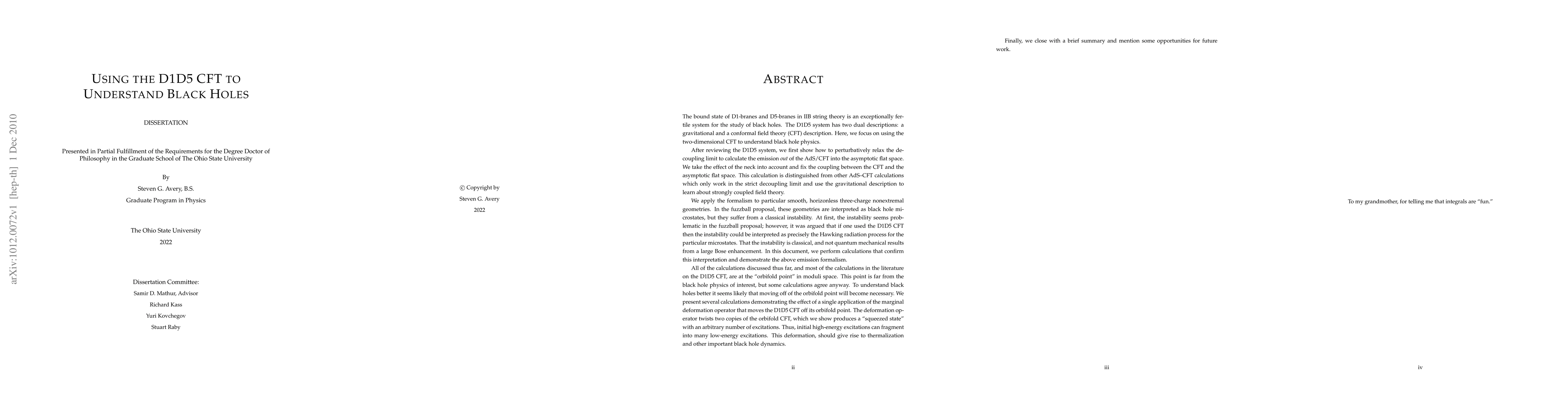 This dissertation explores the use of the D1D5 CFT to understand black holes in string theory, reviewing the D1D5 system's gravity and CFT descriptions and applying them to compute emission spectra analogous to Hawking radiation from fuzzball microstates. It also discusses deformations of the CFT and future research directions.